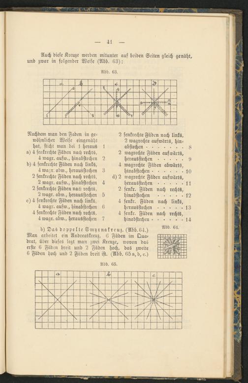 b) Das doppelte Smyrnakreuz. (Abb.64.) Man arbeitet ein Andreaskreuz, 6 Fäden im Quadrat, über dieses legt man zwei Kreuze, wovon das erste 6 Fäden breit und 2 Fäden hoch, das zweite 6 Fäden hoch und 2 Fäden breit ist. (Abb. 65 a, b,e.)