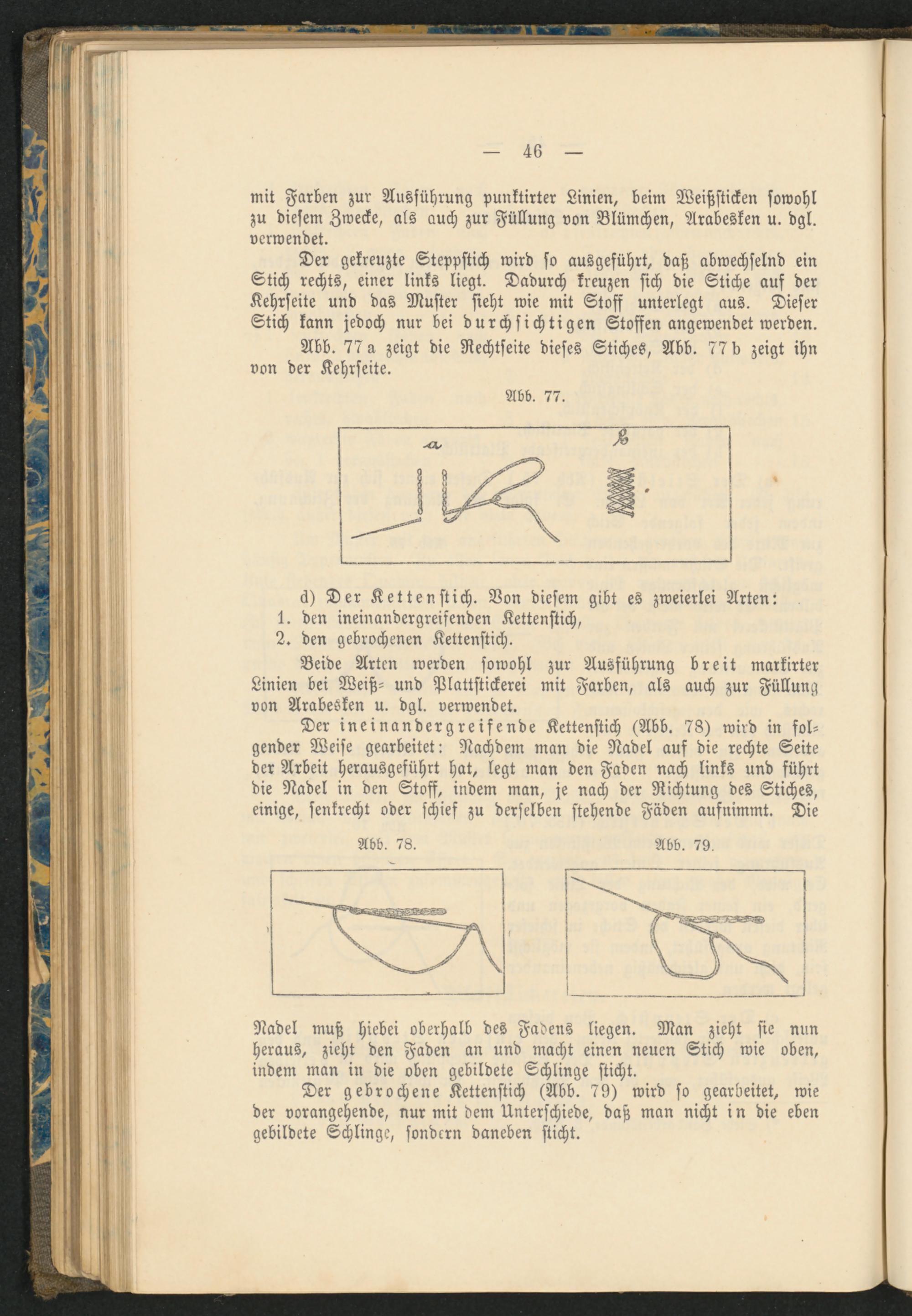 Der ineinandergreifende Kettenstich (Abb. 78) wird in folgender Weise gearbeitet: Nachdem man die Nadel auf die rechte Seite der Arbeit herausgeführt hat, legt man den Faden nach links und führt die Nadel in den Stoff, indem man, je nach der Richtung des Stiches, einige, senkrecht oder schief zu derselben stehende Fäden aufnimmt. Die