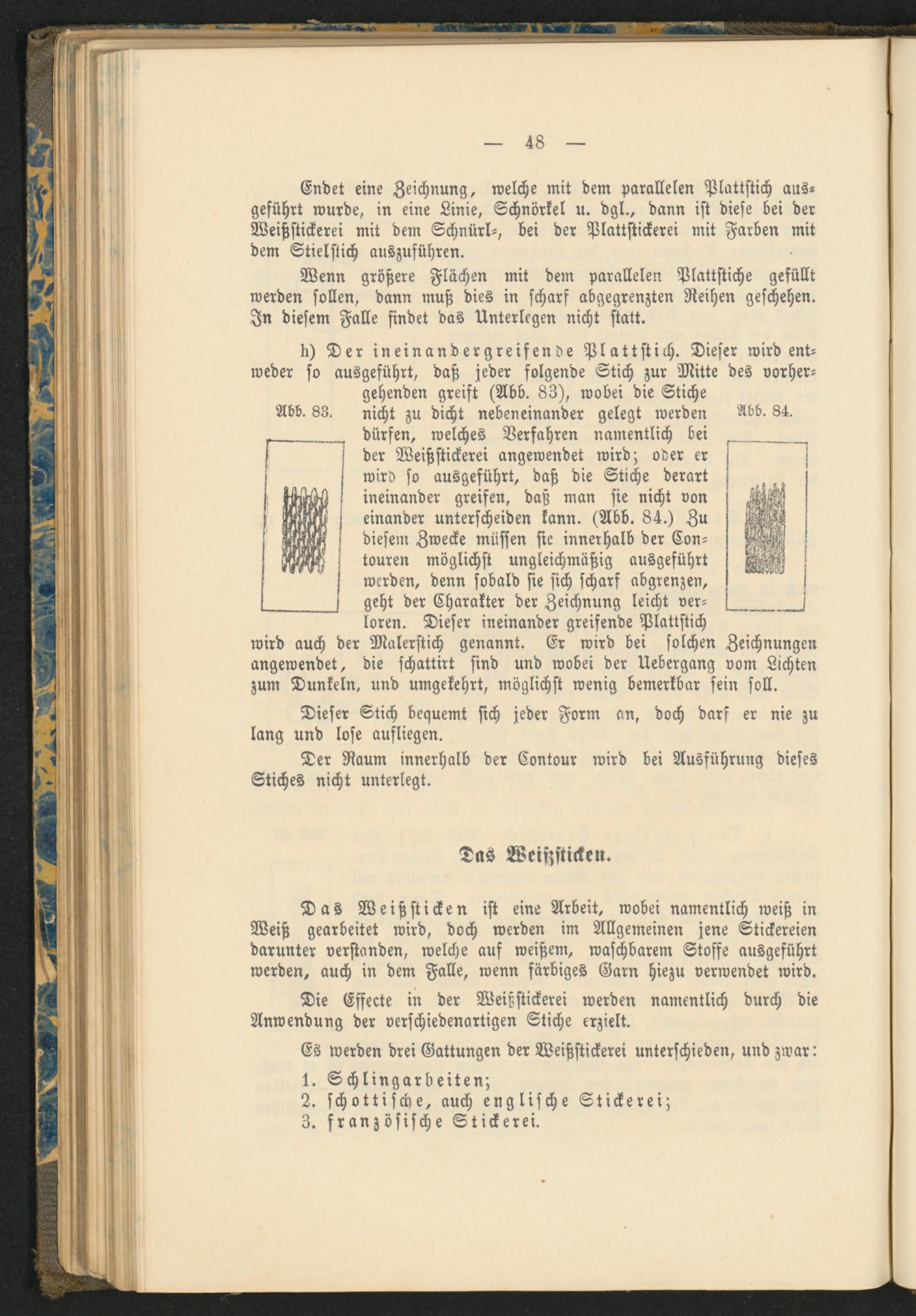 k) Der ineinandergreifende Plattstich. Dieser wird entweder so ausgeführt, daß jeder folgende Stich zur Mitte des vorhergehenden greift (Abb. 83), wobei die Stiche Abb. 83. nicht zu dicht nebeneinander gelegt werden Abb. 84. dürfen, welches Verfahren namentlich bei der Weißstickerei angewendet wird; oder er wird so ausgeführt, daß die Stiche derart ineinander greifen, daß man sie nicht von einander unterscheiden kann. (Abb. 84.) Zu diesem Zwecke müssen sie innerhalb der Con- touren möglichst ungleichmäßig ausgeführt werden, denn sobald sie sich scharf abgrenzen, geht der Charakter der Zeichnung leicht verloren. Dieser ineinander greifende Plattstich wird auch der Malerstich genannt. Er wird bei solchen Zeichnungen angewendet, die schattirt sind und wobei der Uebergang vom Lichten zum Dunkeln, und umgekehrt, möglichst wenig bemerkbar sein soll.