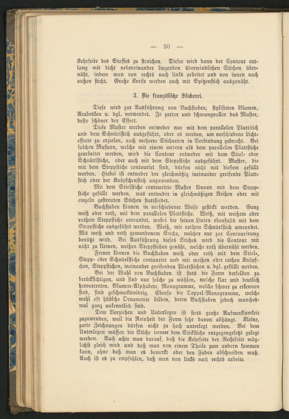 Ferner können die Buchstaben weiß oder roth mit dem Stiel-, Stepp- oder Schnürlstiche contourirt und mit weißen oder rothen Knöpf- chen, Steppstichen, ineinander greifenden Plattstichen u. dgl. gefüllt werden.