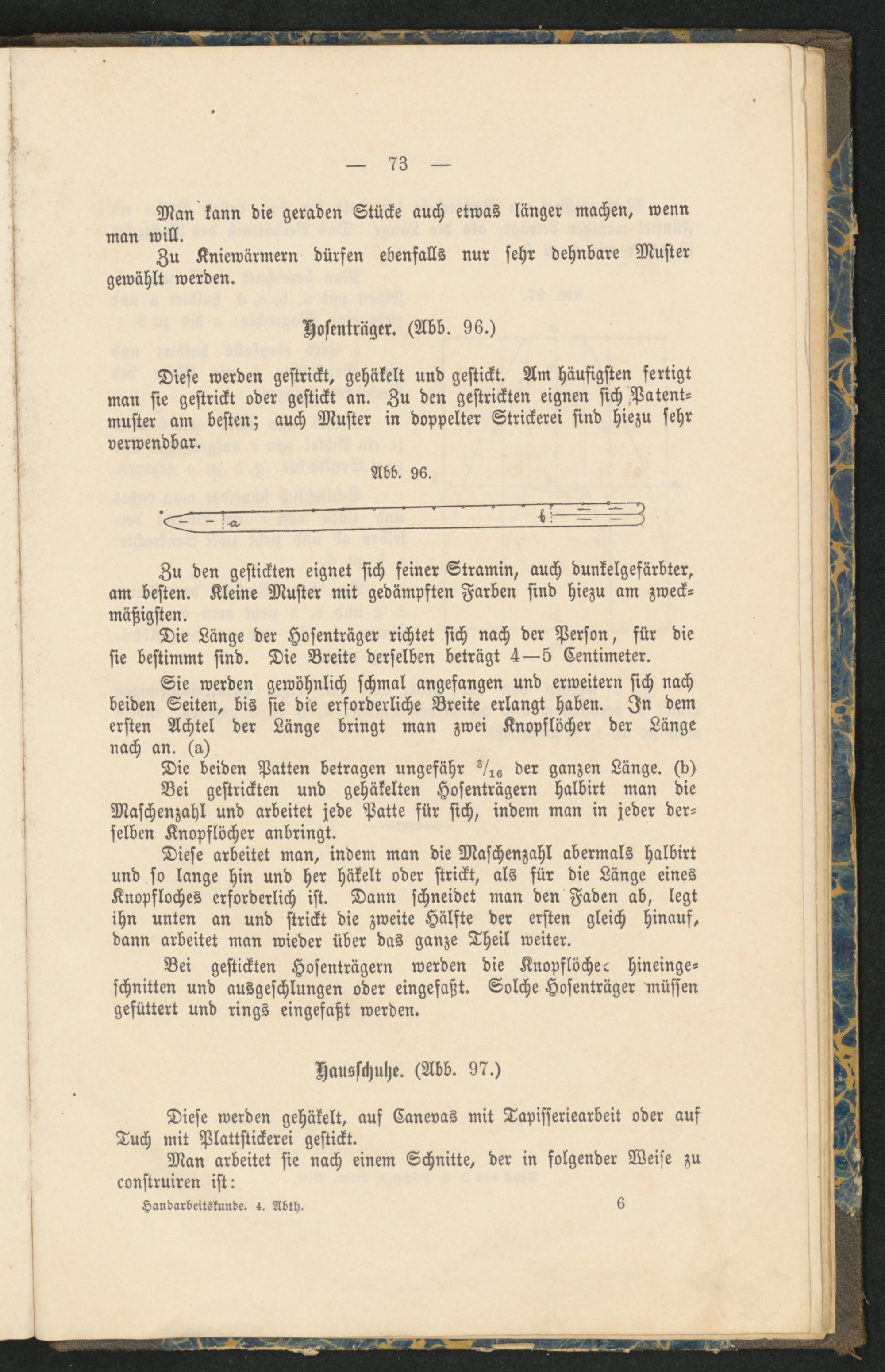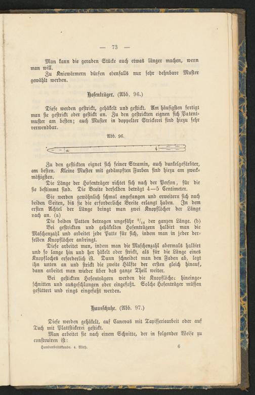 Die Länge der Hosenträger richtet sich nach der Person, für die sie bestimmt sind. Die Breite derselben beträgt 4—5 Centimeter.
