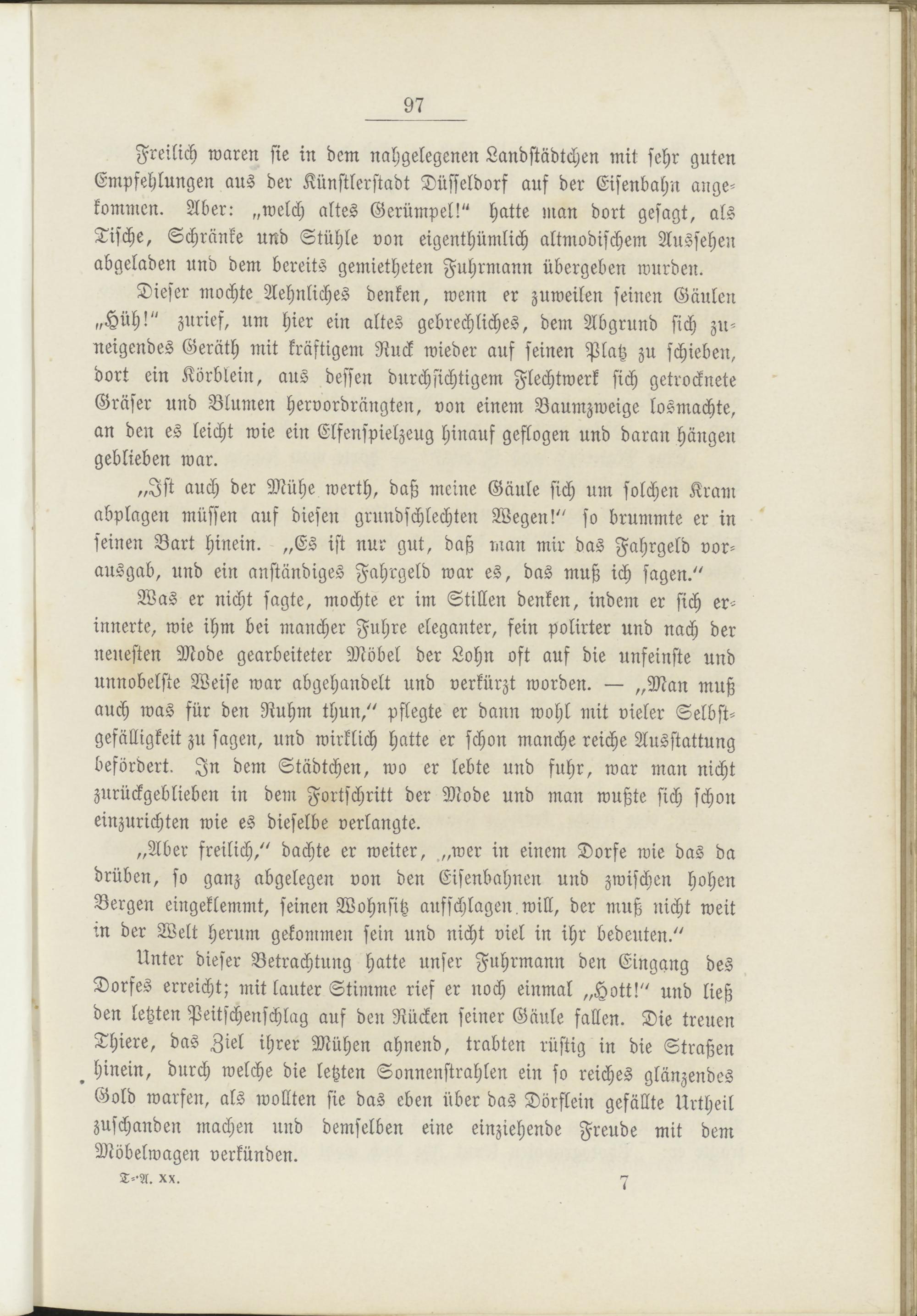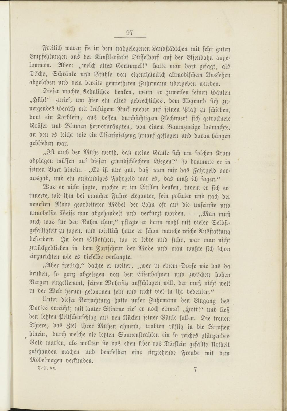 Unter dieser Betrachtung hatte unser Fuhrmann den Eingang des Dorfes erreicht; mit lauter Stimme rief er noch einmal „Hott!" und ließ den letzten Peitschenschlag auf den Rücken seiner Gäule fallen. Die treuen Thiere, das Ziel ihrer Mühen ahnend, trabten rüstig in die Straßen d hinein, durch welche die letzten Sonnenstrahlen ein so reiches glänzendes Gold warfen, als wollten sie das eben über das Dörflein gefällte Urtheil zuschanden machen und demselben eine einziehende Freude mit dem Möbelwagen verkünden.