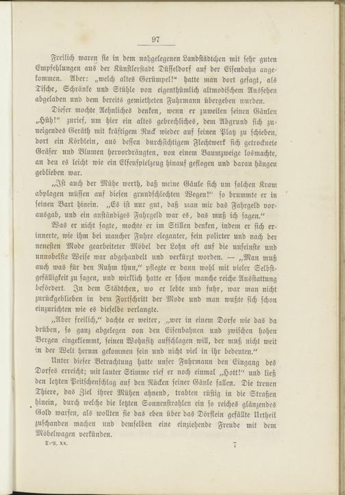 Was er nicht sagte, mochte er im Stillen denken, indem er sich erinnerte, wie ihm bei mancher Fuhre eleganter, fein polirter und nach der neuesten Mode gearbeiteter Möbel der Lohn oft auf die unfeinste und unnobelste Weise war abgehandelt und verkürzt worden. — „Man muß auch was für den Ruhm thun," pflegte er dann wohl mit vieler Selbstgefälligkeit zu sagen, und wirklich hatte er schon manche reiche Ausstattung befördert. In dem Städtchen, wo er lebte und fuhr, war man nicht zurückgeblieben in dem Fortschritt der Mode und man wußte sich schon einzurichten wie es dieselbe verlangte.