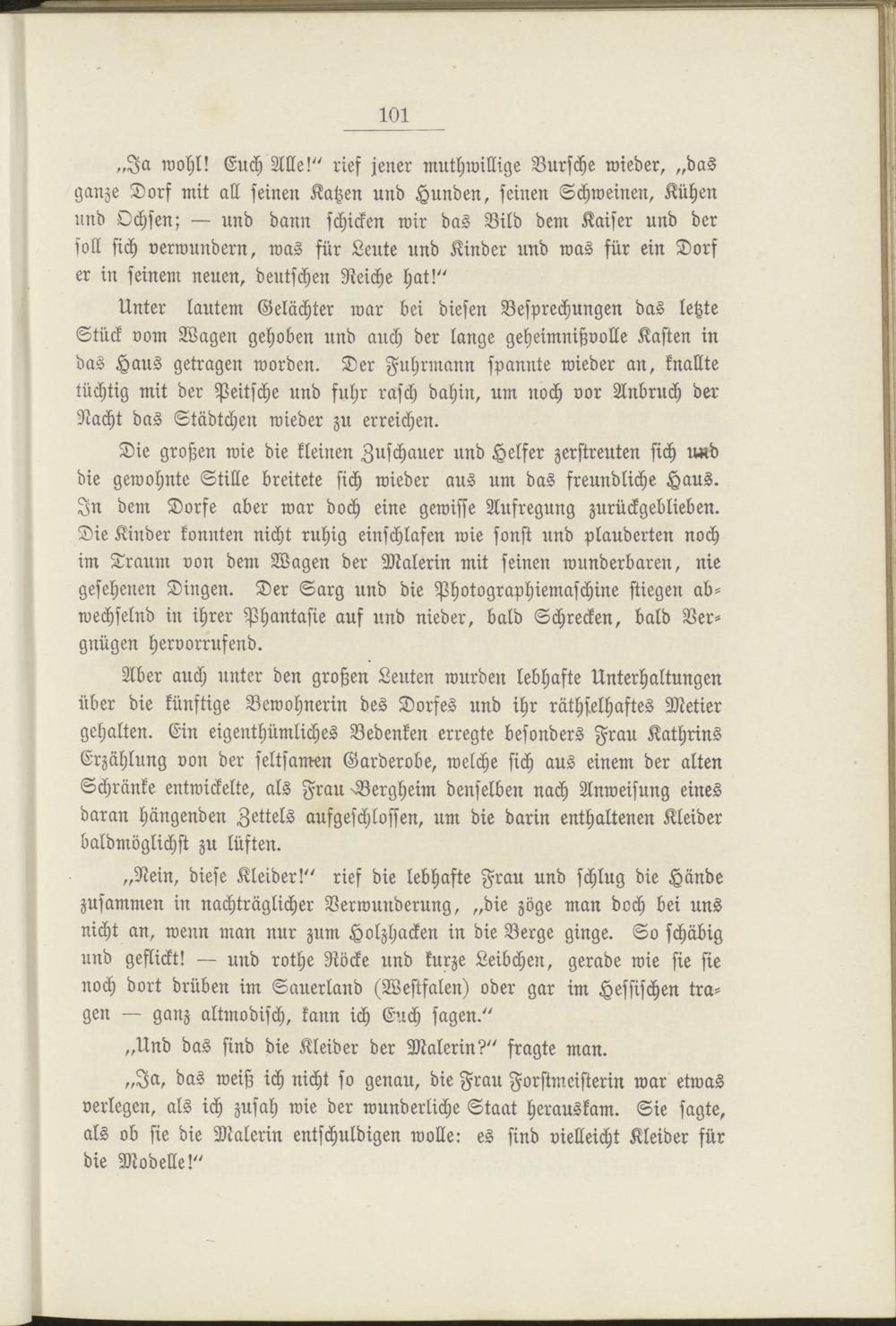 Die großen wie die kleinen Zuschauer und Helfer zerstreuten sich und die gewohnte Stille breitete sich wieder aus um das freundliche Haus. In dem Dorfe aber war doch eine gewisse Aufregung zurückgeblieben. Die Kinder konnten nicht ruhig einschlafen wie sonst und plauderten noch im Traum von dem Wagen der Malerin mit seinen wunderbaren, nie gesehenen Dingen. Der Sarg und die Photographiemaschine stiegen abwechselnd in ihrer Phantasie auf und nieder, bald Schrecken, bald Vergnügen hervorrufend.