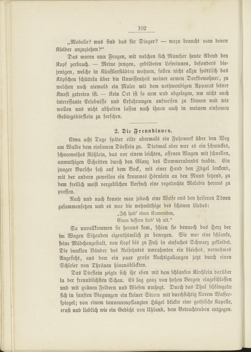 Das waren nun Fragen, mit welchen sich Mancher heute Abend den Kops zerbrach. — Meine jungen, gebildeten Leserinnen, besonders diejenigen, welche in Künstlerstädien wohnen, sollen nicht allzu spöttisch das Köpfchen schütteln über die Unwissenheit meiner armen Dorfbewohner, zu welchen noch niemals ein Maler mit dem nothwendigen Apparat seiner Kunst getreten ist. — Kein Ort ist so arm und abgelegen, um nicht auch interessante Erlebnisse und Erfahrungen ausweisen zu können und wir wollen uns nicht abhalten lassen nach ihnen auch in meinem einsamen Gebirgsdörflein zu forschen.