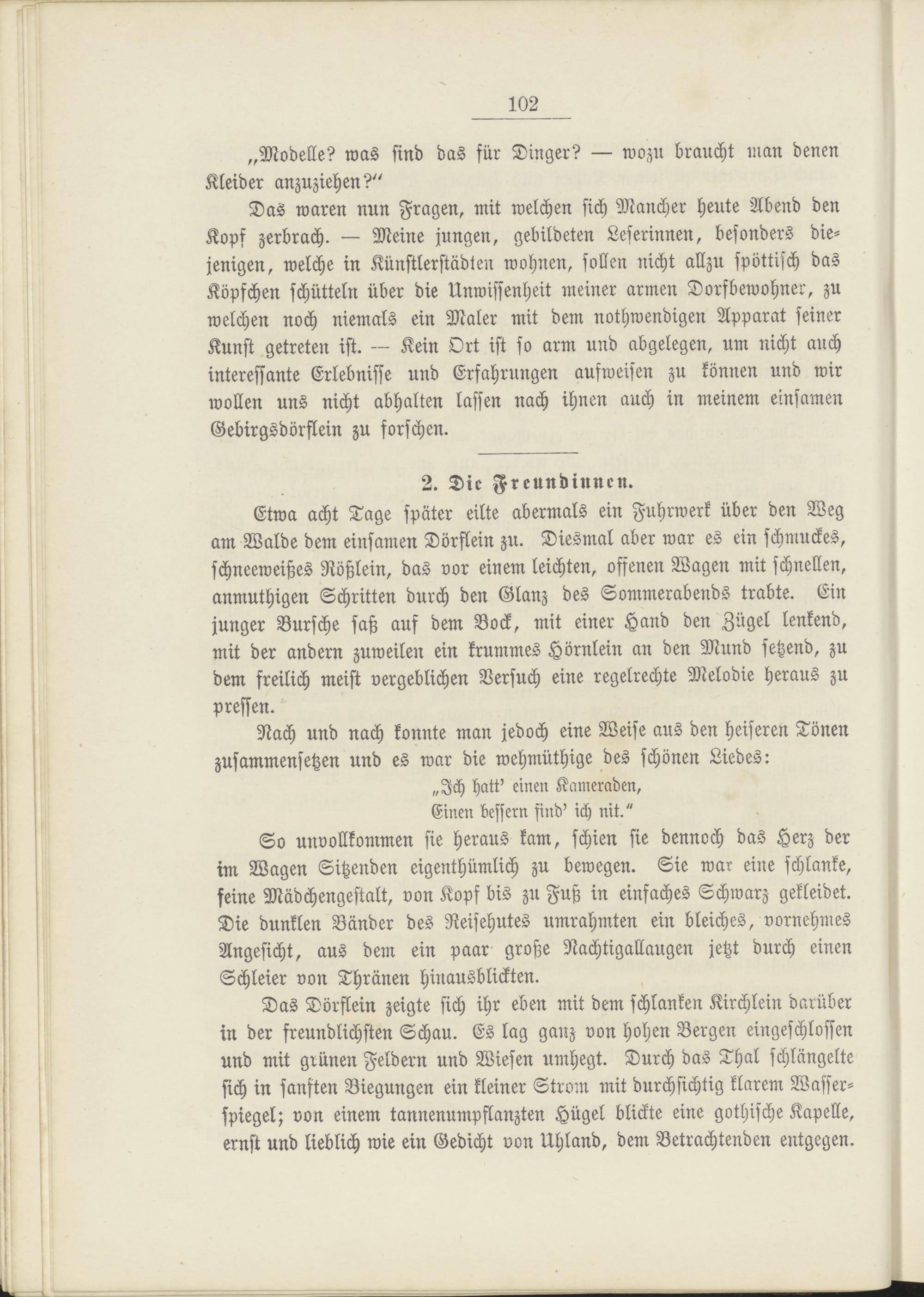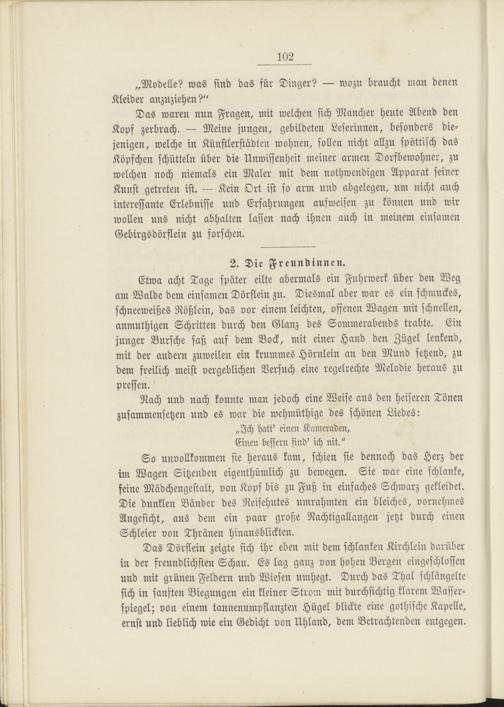 Das Dörflein zeigte sich ihr eben mit dem schlanken Kirchlein darüber in der freundlichsten Schau. Es lag ganz von hohen Bergen eingeschlossen und mit grünen Feldern und Wiesen umhegt. Durch das Thal schlängelte sich in sanften Biegungen ein kleiner Strom mit durchsichtig klarem Wasserspiegel; von einem tannenumpflanzten Hügel blickte eine gothische Kapelle, ernst und lieblich wie ein Gedicht von Uhland, dem Betrachtenden entgegen.