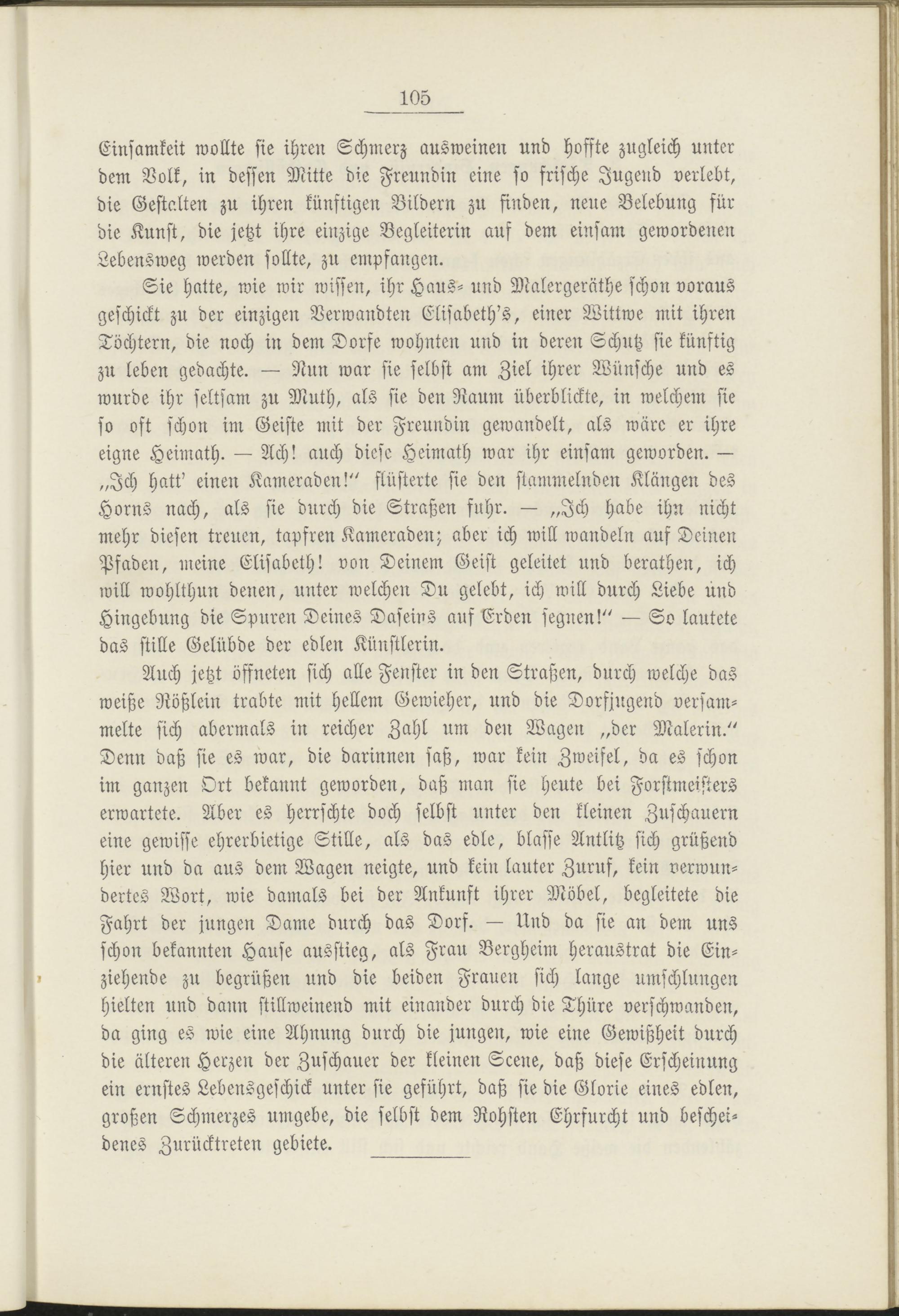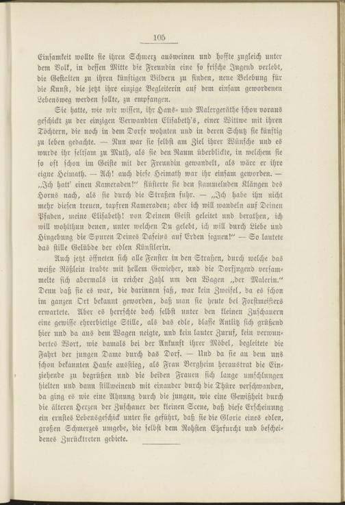 Sie hatte, wie wir wissen, ihr Haus- und Malergeräthe schon voraus geschickt zu der einzigen Verwandten Elisabeth's, einer Wittwe mit ihren Töchtern, die noch in dem Dorfe wohnten und in deren Schutz sie künftig zu leben gedachte. — Nun war sie selbst am Ziel ihrer Wünsche und es wurde ihr seltsam zu Muth, als sie den Raum überblickte, in welchem sie so oft schon im Geiste mit der Freundin gewandelt, als wäre er ihre eigne Heimath. — Ach! auch diese Heimath war ihr einsam geworden. — „Ich hatt' einen Kameraden!" flüsterte sie den stammelnden Klängen des Horns nach, als sie durch die Straßen fuhr. — „Ich habe ihn nicht mehr diesen treuen, tapfren Kameraden; aber ich will wandeln auf Deinen Pfaden, meine Elisabeth! von Deinem Geist geleitet und berathen, ich will wohlthun denen, unter welchen Du gelebt, ich will durch Liebe und Hingebung die Spuren Deines Daseins auf Erden segnen!" — So lautete das stille Gelübde der edlen Künstlerin.