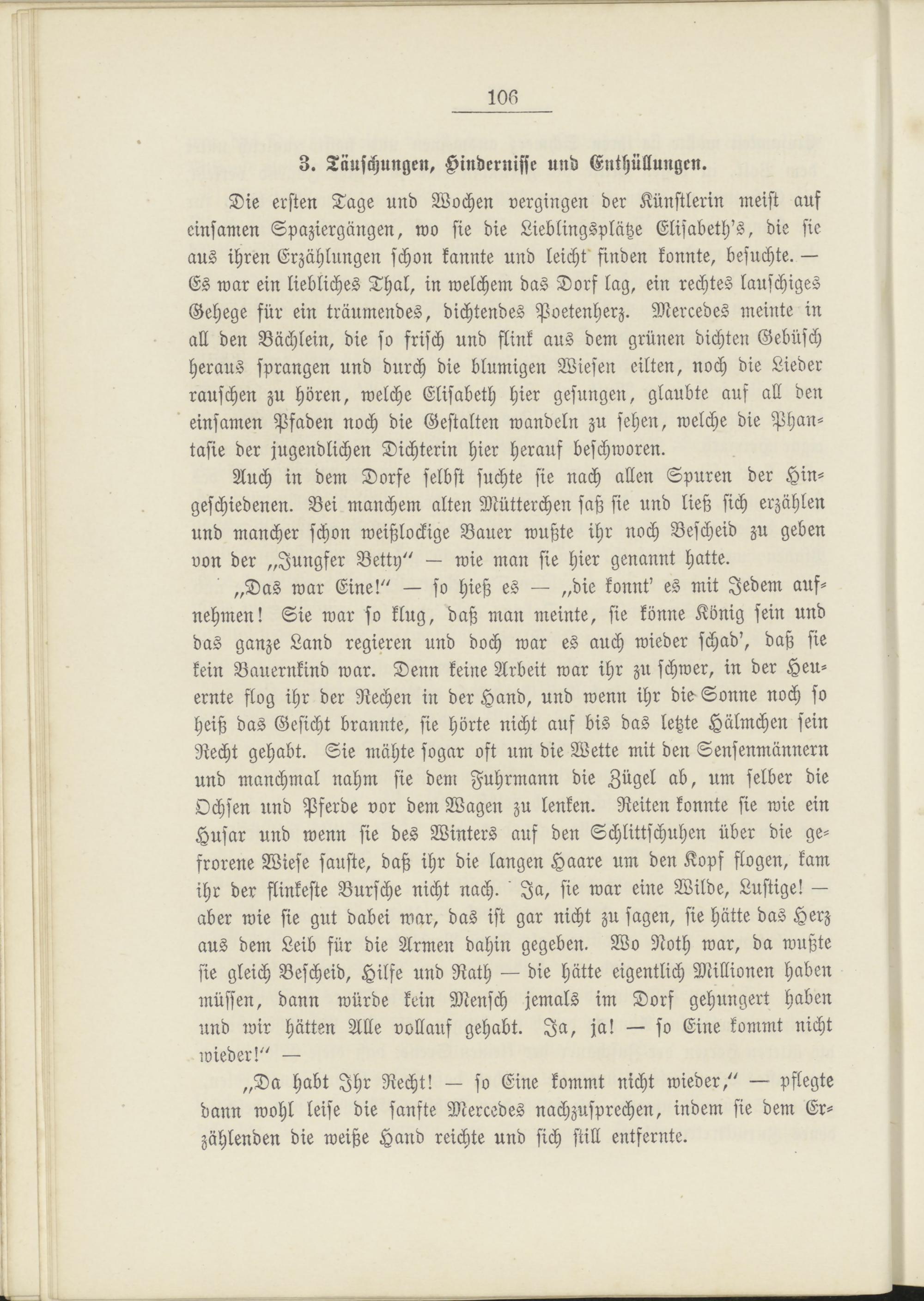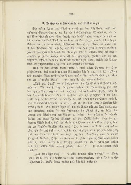 Die ersten Tage und Wochen vergingen der Künstlerin meist auf einsamen Spaziergänger:, wo sie die Lieblingsplätze Elisabeth's, die sie aus ihren Erzählungen schon kannte und leicht' finden konnte, besuchte. — Es war ein liebliches Thal, in welchem das Dorf lag, ein rechtes lauschiges Gehege für ein träumendes, dichtendes Poetenherz. Mercedes meinte in all den Büchlein, die so frisch und flink aus dem grünen dichten Gebüsch heraus sprangen und durch die blumigen Wiesen eilten, noch die Lieder rauschen zu hören, welche Elisabeth hier gesungen, glaubte auf all den einsamen Pfaden noch die Gestalten wandeln zu sehen, welche die Phantasie der jugendlichen Dichterin hier herauf beschworen.