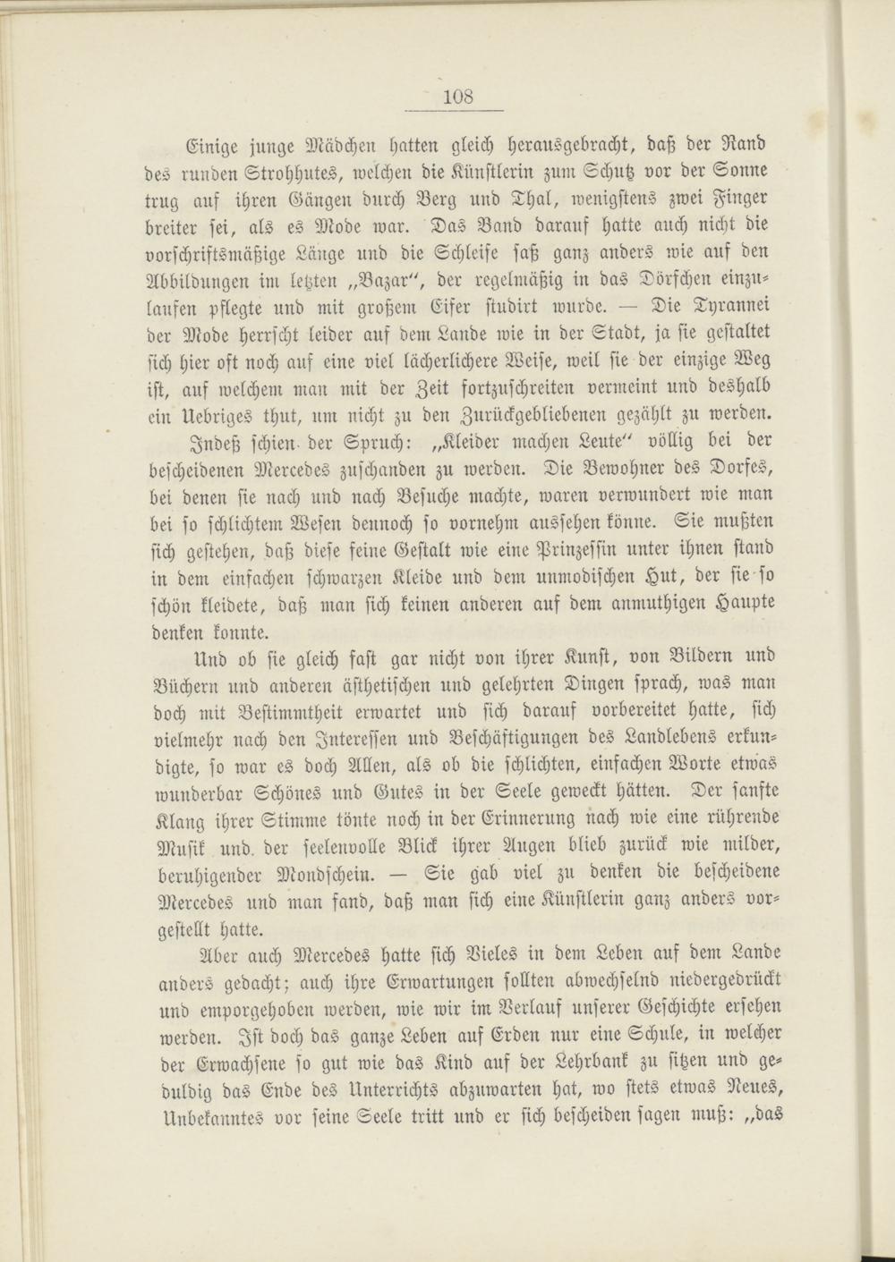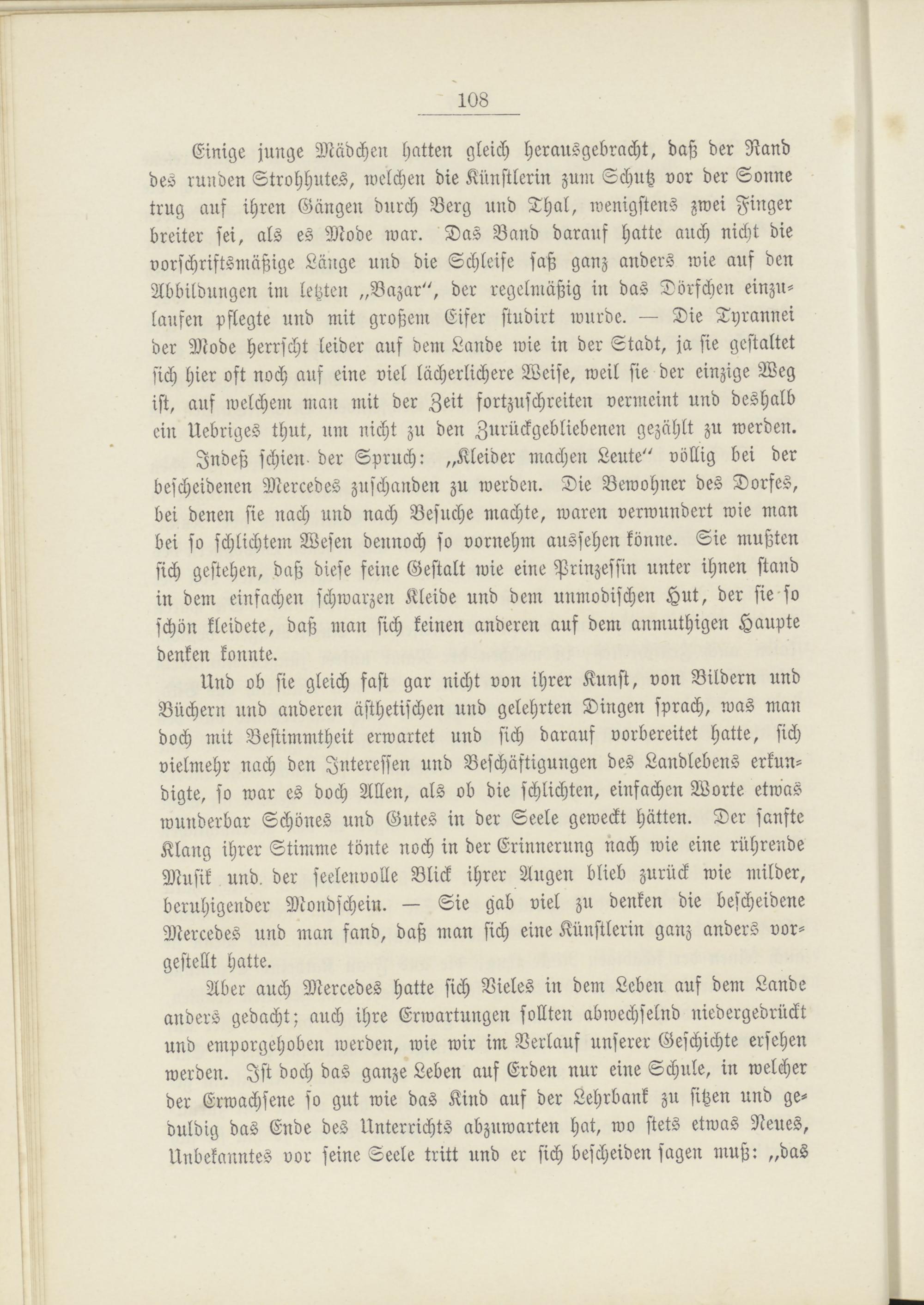 Und ob sie gleich fast gar nicht von ihrer Kunst, von Bildern und Büchern und anderen ästhetischen und gelehrten Dingen sprach, was man doch mit Bestimmtheit erwartet und sich darauf vorbereitet hatte, sich vielmehr nach den Interessen und Beschäftigungen des Landlebens erkundigte, so war es doch Allen, als ob die schlichten, einfachen Worte etwas wunderbar Schönes und Gutes in der Seele geweckt hätten. Der sanfte Klang ihrer Stimme tönte noch in der Erinnerung nach wie eine rührende Musik und. der seelenvolle Blick ihrer Augen blieb zurück wie milder, beruhigender Mondschein. — Sie gab viel zu denken die bescheidene Mercedes und man fand, daß man sich eine Künstlerin ganz anders vorgestellt hatte.