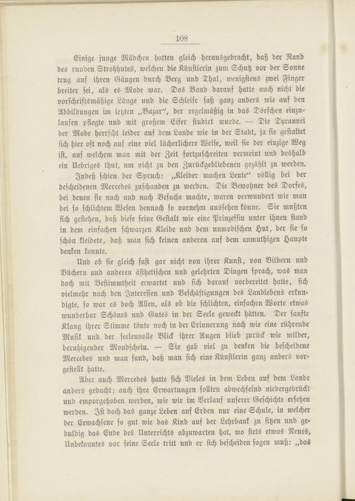 Indeß schien- der Spruch: „Kleider machen Leute" völlig bei der bescheidenen Mercedes zuschanden zu werden. Die Bewohner des Dorfes, bei denen sie nach und nach Besuche machte, waren verwundert wie man bei so schlichtem Wesen dennoch so vornehm aussehen könne. Sie mußten sich gestehen, daß diese seine Gestalt wie eine Prinzessin unter ihnen stand in dem einfachen schwarzen Kleide und dem unmodischen Hut, der sie-so schön kleidete, daß man sich keinen anderen auf dem unmuthigen Haupte denken konnte.