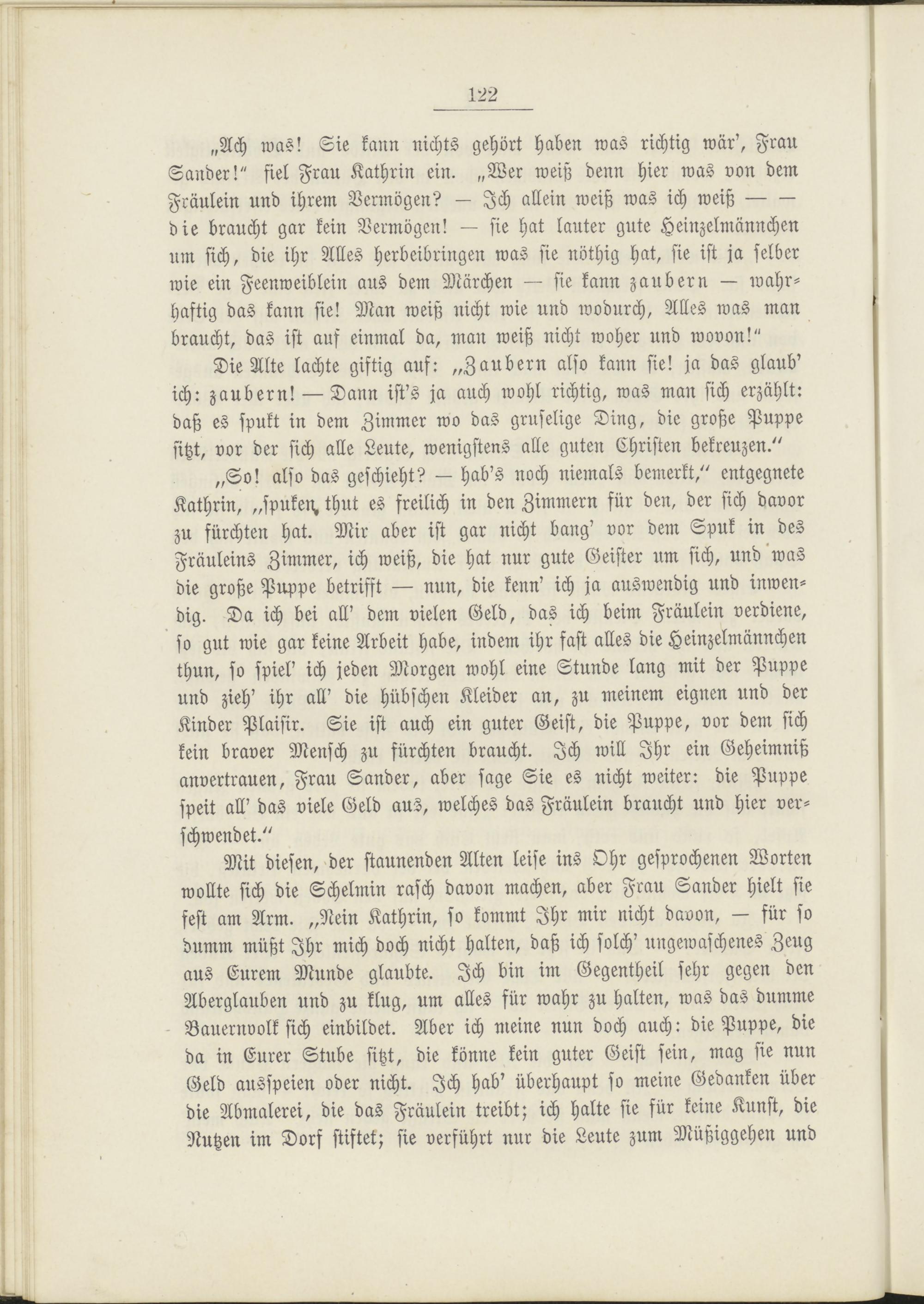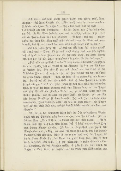Mit diesen, der staunenden Alten leise ins Ohr gesprochenen Worten wollte sich die Schelmin rasch davon machen, aber Frau Sander hielt sie fest am Arm. „Nein Kathrin, so kommt Ihr mir nicht davon, — für so dumm müßt Ihr mich doch nicht halten, daß ich solch' ungewaschenes Zeug aus Eurem Munde glaubte. Ich bin im Gegentheil sehr gegen den Aberglauben und zu klug, um alles für wahr zu halten, was das dumme Bauernvolk sich einbildet. Aber ich meine nun doch auch: die Puppe, die da in Eurer Stube sitzt, die könne kein guter Geist sein, mag sie nun Geld ausspeien oder nicht. Ich hab' überhaupt so meine Gedanken über die Abmalerei, die das Fräulein treibt; ich halte sie für keine Kunst, die Nutzen im Dorf stiftet; sie verführt nur die Leute zum Müßiggehen und
