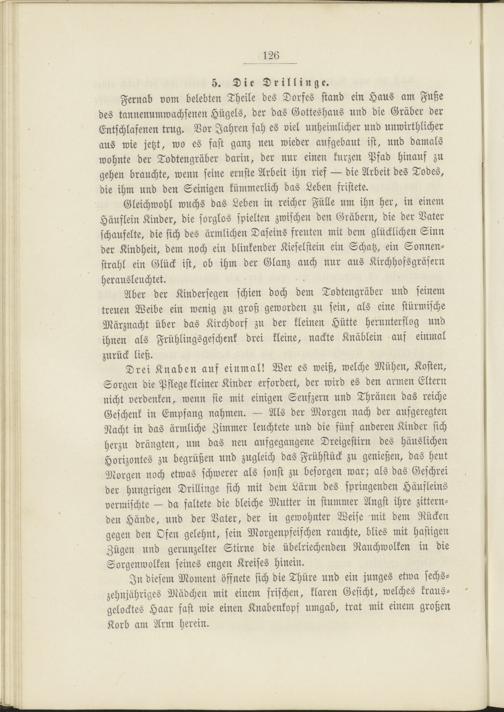 Drei Knaben auf einmal! Wer es weiß, welche Mühen, Kosten, Sorgen die Pflege kleiner Kinder erfordert, der wird es den armen Eltern nicht verdenken, wenn sie mit einigen Seufzern und Thränen das reiche Geschenk in Empfang nahmen. — Als der Morgen nach der aufgeregten Nacht in das ärmliche Zimmer leuchtete und die fünf anderen Kinder sich herzu drängten, um das neu aufgegangene Dreigestirn des häuslichen Horizontes zu begrüßen und zugleich das Frühstück zu genießen, das heut Morgen noch etwas schwerer als sonst zu besorgen war; als das Geschrei der hungrigen Drillinge sich mit dem Lärm des springenden Häufleins vermischte — da faltete die bleiche Mutter in stummer Angst ihre zitternden Hände, und der Vater, der in gewohnter Weise mit dem Rücken gegen den Ofen gelehnt, sein Morgenpfeifchen rauchte, blies mit hastigen Zügen und gerunzelter Stirne die übelriechenden Rauchwolken in die Sorgenmolken seines engen Kreises hinein.