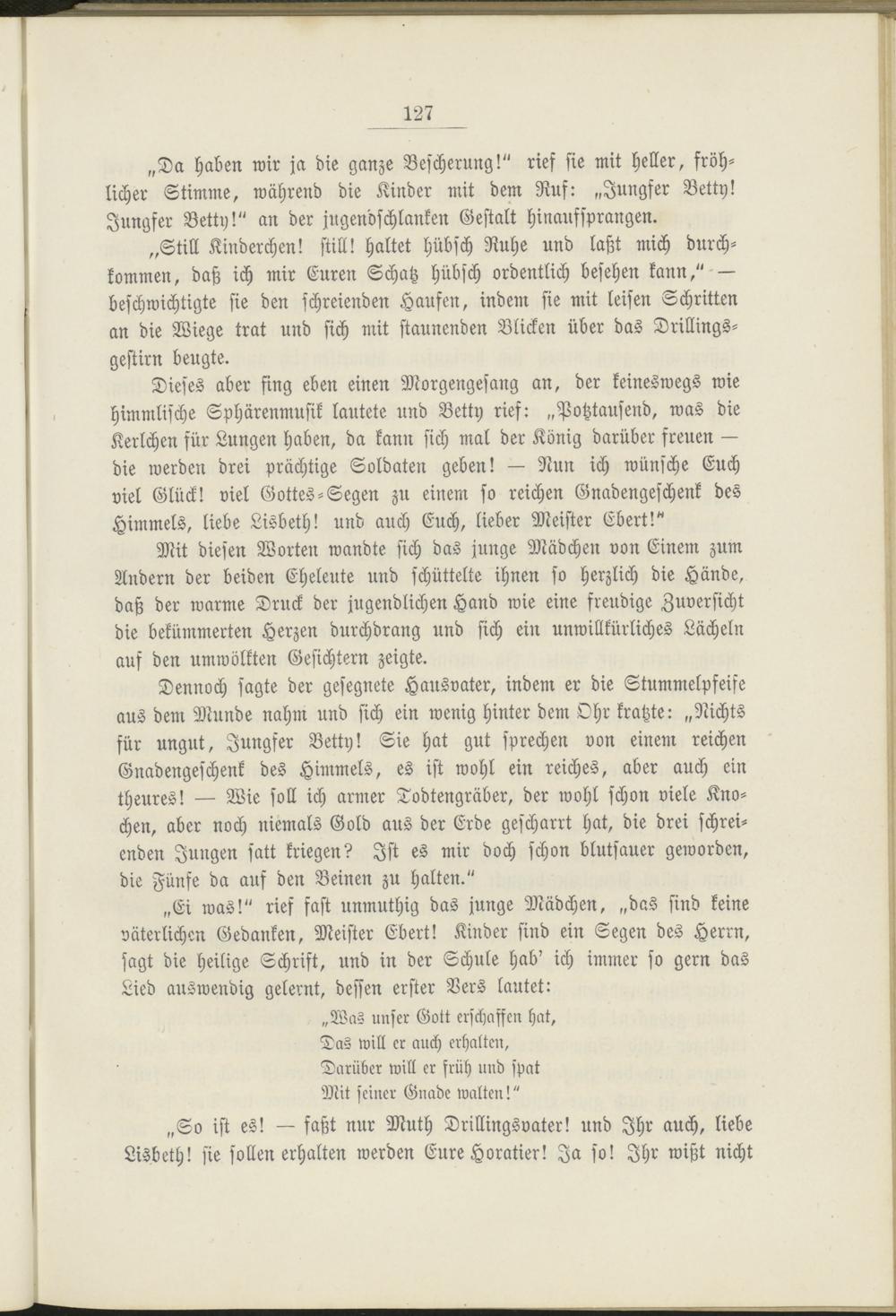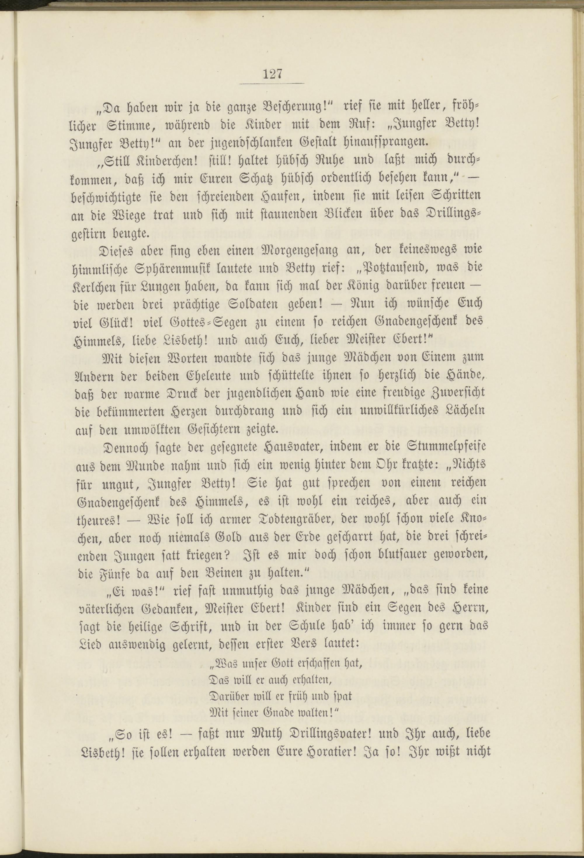 Dieses aber fing eben einen Morgengesang an, der keineswegs wie himmlische Sphärenmusik lautete und Betty rief: „Potztausend, was die Kerlchen für Lungen haben, da kann sich mal der König darüber freuen — die werden drei prächtige Soldaten geben! — Nun ich wünsche Euch viel Glück! viel Gottes-Segen zu einem so reichen Gnadengeschenk des Himmels, liebe Lisbeth! und auch Euch, lieber Meister Ebert!"