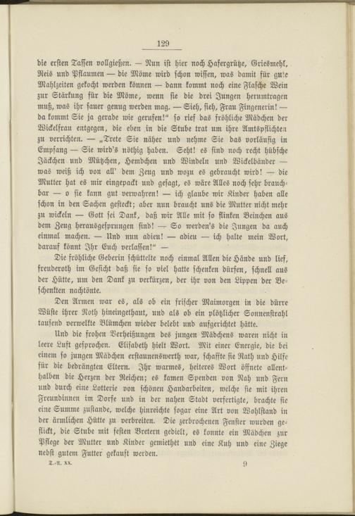 Und die frohen Verheißungen des jungen Mädchens waren nicht in leere Luft gesprochen. Elisabeth hielt Wort. Mit einer Energie, die bei einem so jungen Mädchen erstaunenswerth war, schaffte sie Rath und Hilfe für die bedrängten Eltern. Ihr warmes, heiteres Wort öffnete allenthalben die Herzen der Reichen; es kamen Spenden von Nah und Fern und durch eine Lotterie von schönen Handarbeiten, welche sie mit ihren Freundinnen im Dorfe und in der nahen Stadt verfertigte, brachte sie eine Summe zustande, welche hinreichte sogar eine Art von Wohlstand in der ärmlichen Hütte zu verbreiten. Die zerbrochenen Fenster wurden geflickt, die Stube mit festen Bretern gedielt, es konnte ein Mädchen zur Pflege der Mutter und Kinder gemiethet und eine Kuh und eine Ziege nebst gutem Futter gekauft werden.