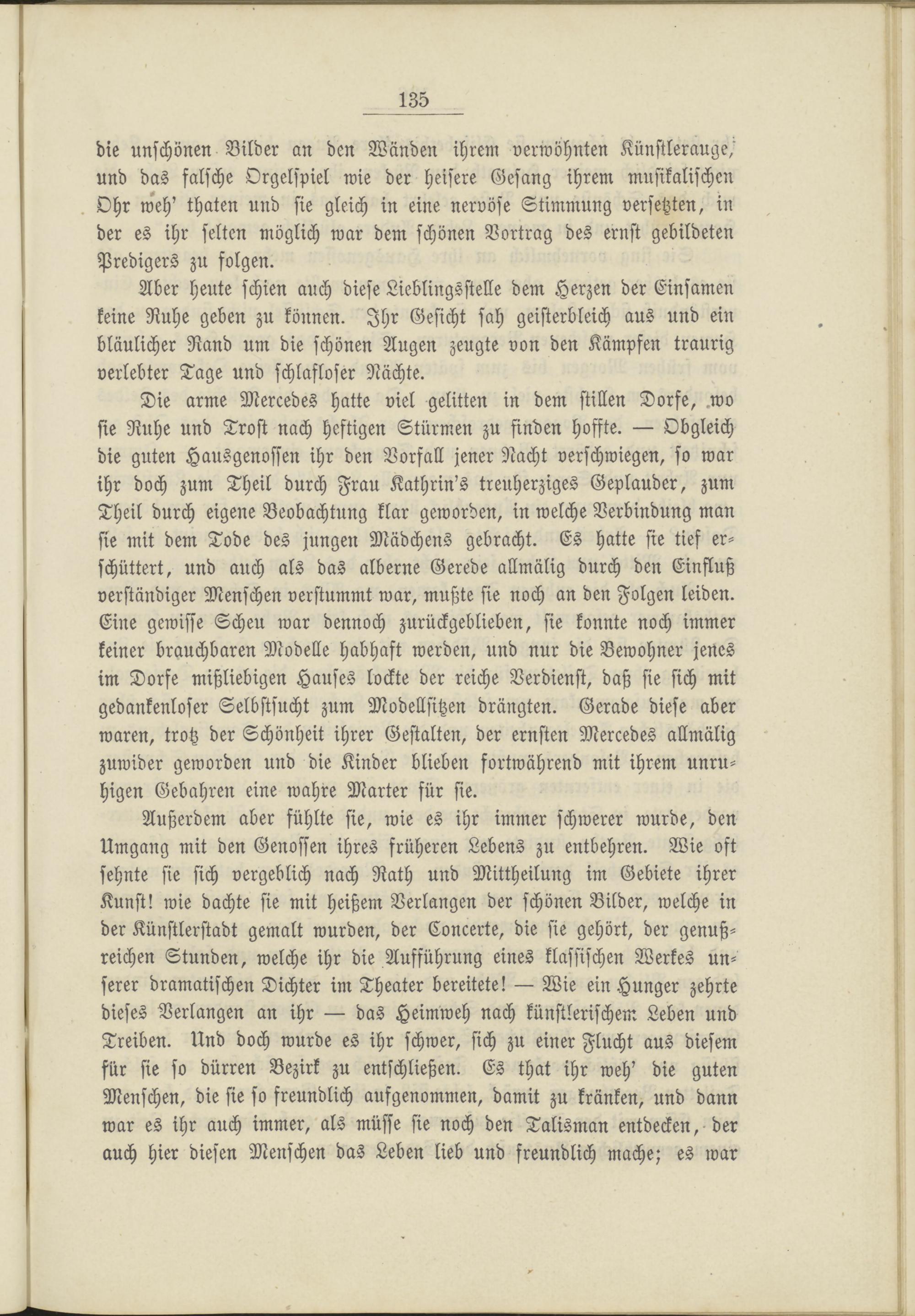 Die arme Mercedes hatte viel gelitten in dem stillen Dorfe, .wo sie Ruhe und Trost nach heftigen Stürmen zu finden hoffte. — Obgleich die guten Hausgenossen ihr den Vorfall jener Nacht verschwiegen, so war ihr doch zum Theil durch Frau Kathrin's treuherziges Geplauder, zum Theil durch eigene Beobachtung klar geworden, in welche Verbindung man sie mit dem Tode des jungen Mädchens gebracht. Es hatte sie tief erschüttert, und auch als das alberne Gerede allmälig durch den Einfluß verständiger Menschen verstummt war, mußte sie noch an den Folgen leiden. Eine gewisse Scheu war dennoch zurückgeblieben, sie konnte noch immer keiner brauchbaren Modelle habhaft werden, und nur die Bewohner jenes im Dorfe mißliebigen Hauses lockte der reiche Verdienst, daß sie sich mit gedankenloser Selbstsucht zum Modellsitzen drängten. Gerade diese aber waren, trotz der Schönheit ihrer Gestalten, der ernsten Mercedes allmälig zuwider geworden und die Kinder blieben fortwährend mit ihrem unruhigen Gebühren eine wahre Marter für sie.