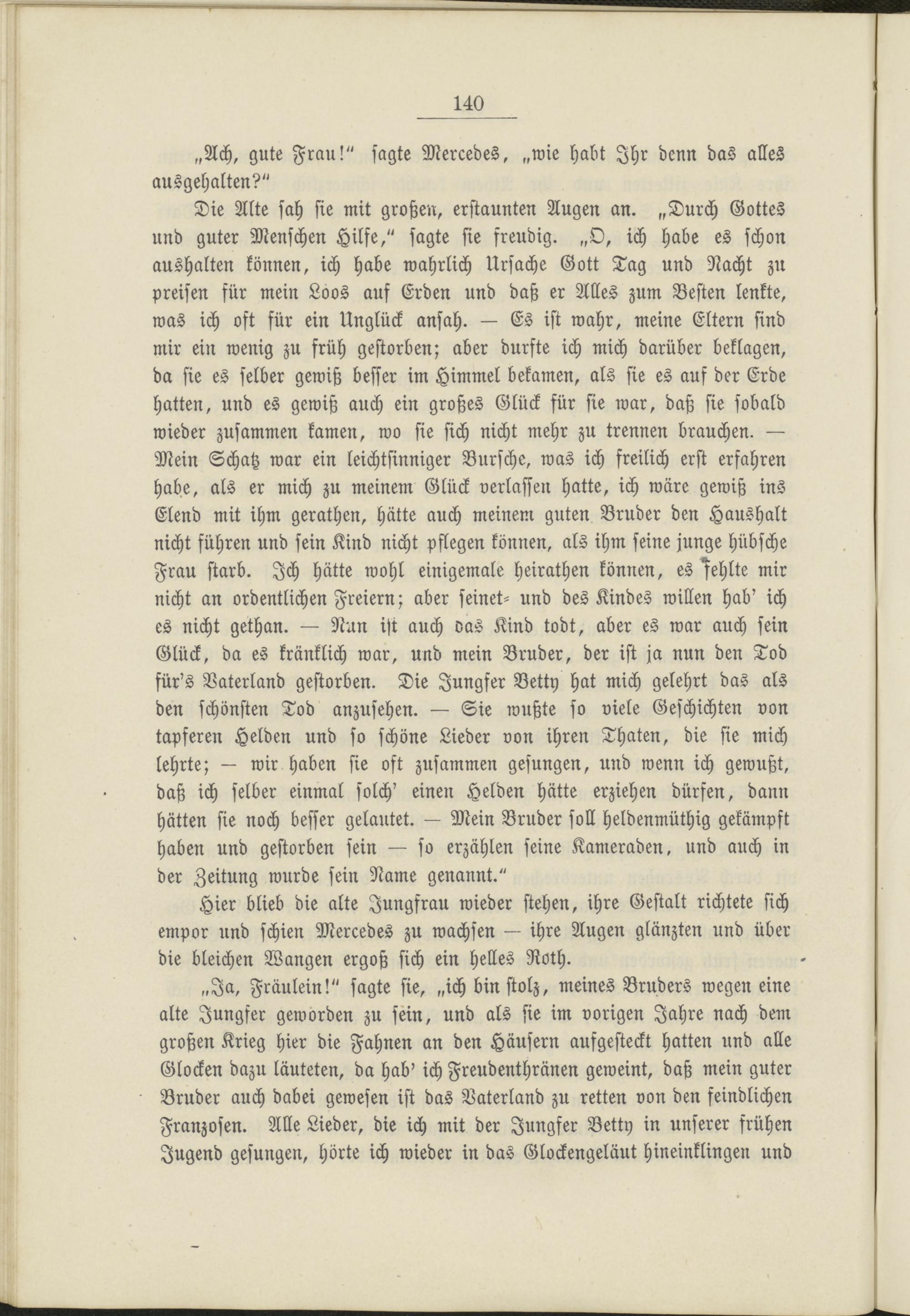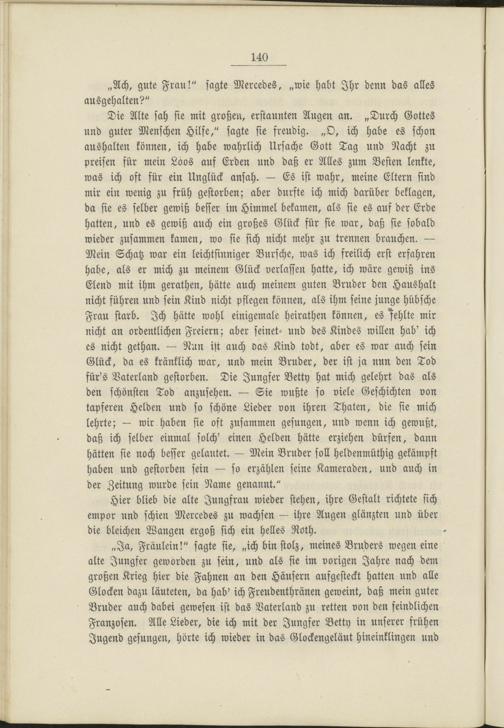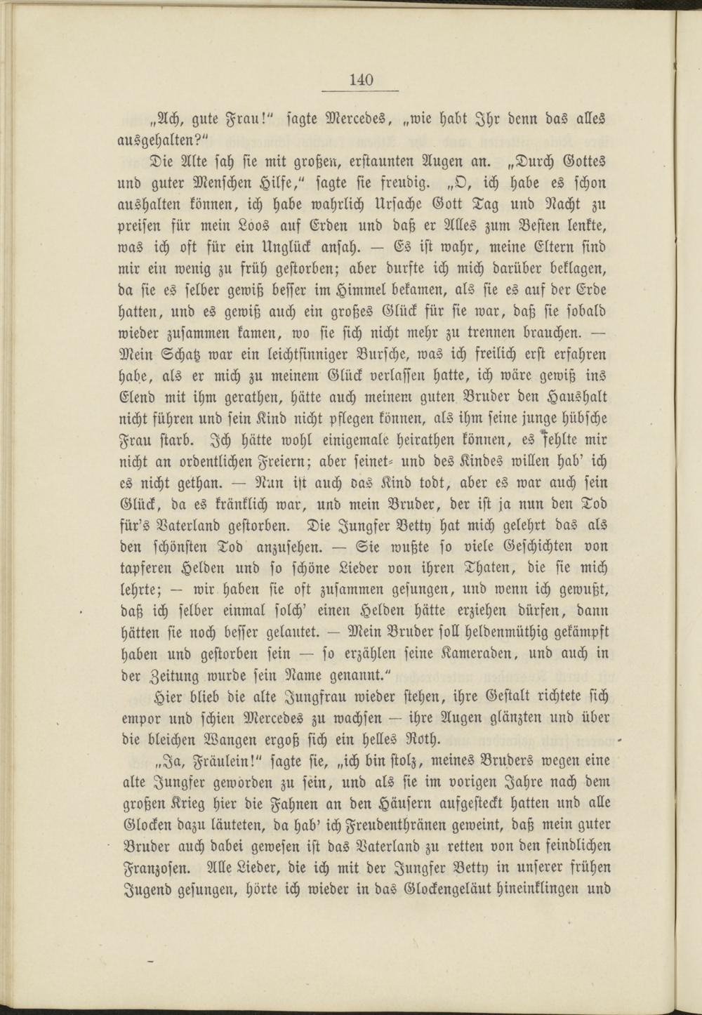 „Ja, Fräulein!" sagte sie, „ich bin stolz, meines Bruders wegen eine alte Jungfer geworden zu sein, und als sie im vorigen Jahre nach dem großen Krieg hier die Fahnen an den Häusern aufgesteckt hatten und alle Glocken dazu läuteten, da hab' ich Freudenthränen geweint, daß mein guter Bruder auch dabei gewesen ist das Vaterland zu retten von den feindlichen Franzosen. Alle Lieder, die ich mit der Jungfer Vetty in unserer frühen Jugend gesungen, hörte ich wieder in das Glockengeläut hineinklingen und