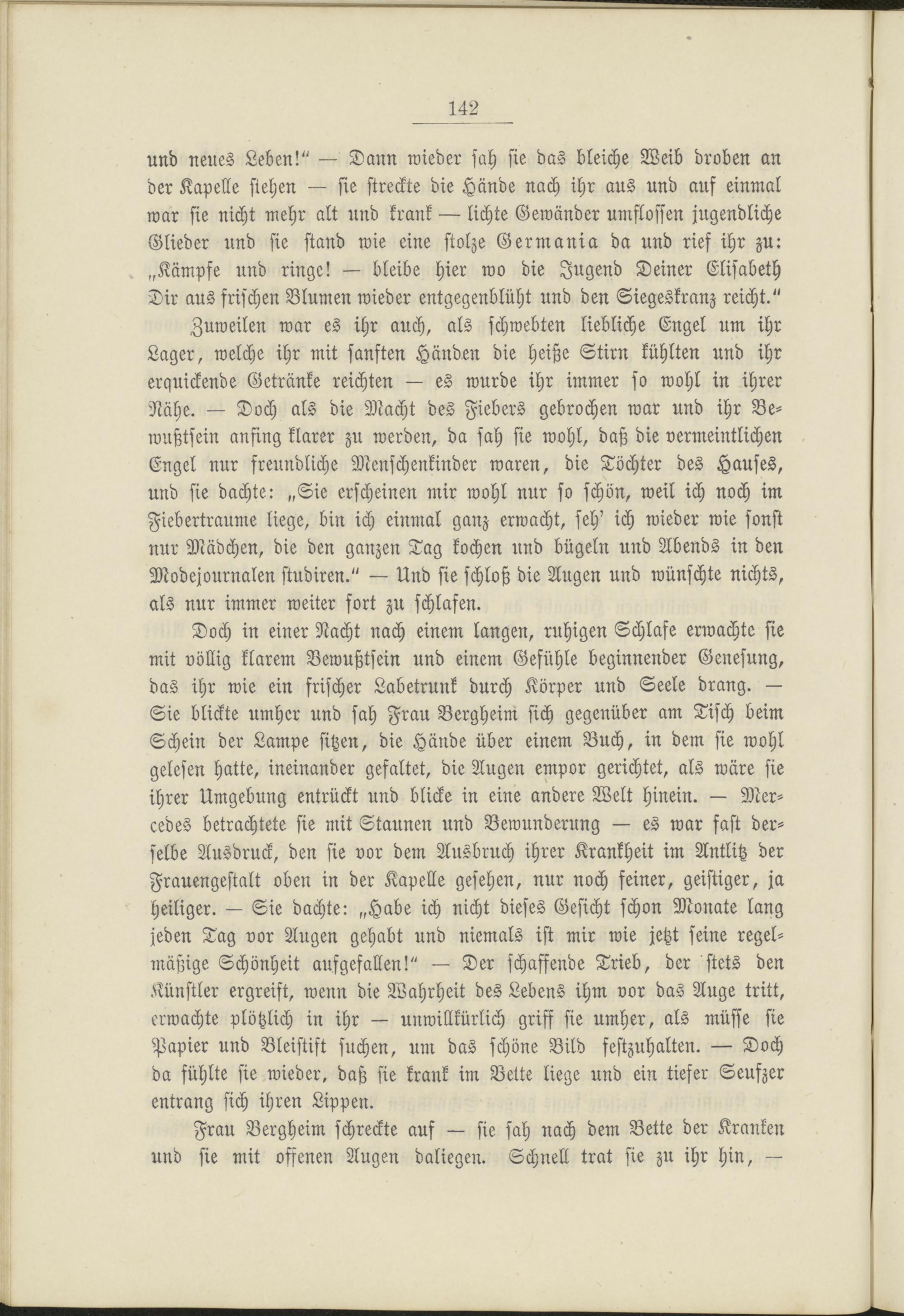 Doch in einer Nacht nach einem langen, ruhigen Schlafe erwachte sie mit völlig klarem Bewußtsein und einem Gefühle beginnender Genesung, das ihr wie ein frischer Labetrunk durch Körper und Seele drang. — Sie blickte umher und sah Frau Bergheim sich gegenüber am Tisch beim Schein der Lampe sitzen, die Hände über einem Buch, in dem sie wohl gelesen hatte, ineinander gefaltet, die Augen empor gerichtet, als wäre sie ihrer Umgebung entrückt und blicke in eine andere Welt hinein. — Mercedes betrachtete sie mit Staunen und Bewunderung — es war fast derselbe Ausdruck, den sie vor dem Ausbruch ihrer Krankheit im Antlitz der Frauengestalt oben in der Kapelle gesehen, nur noch feiner, geistiger, ja heiliger. — Sie dachte: „Habe ich nicht dieses Gesicht schon Monate lang jeden Tag vor Augen gehabt und niemals ist mir wie jetzt seine regelmäßige Schönheit aufgefallen!" — Der schaffende Trieb, der stets den Künstler ergreift, wenn die Wahrheit des Lebens ihm vor das Auge tritt, erwachte plötzlich in ihr — unwillkürlich griff sie umher, als müsse sie Papier und Bleistift suchen, um das schöne Bild festzuhalten. — Doch da fühlte sie wieder, daß sie krank im Bette liege und ein tiefer Seufzer entrang sich ihren Lippen.
