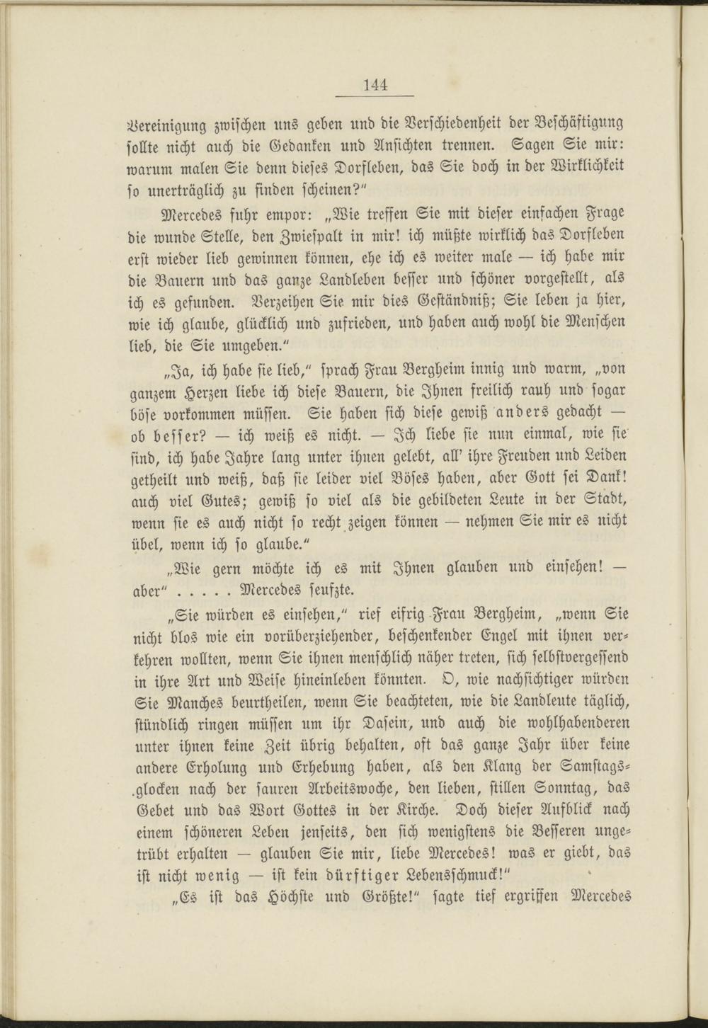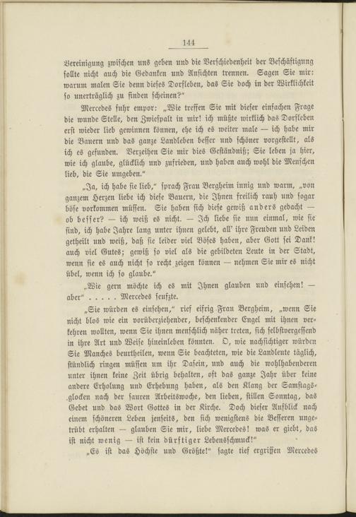 „Ja, ich habe sie lieb," sprach Frau Bergheim innig und warm, „von ganzem Herzen liebe ich diese Bauern, die Ihnen freilich rauh und sogar böse vorkommen müssen. Sie haben sich diese gewiß anders gedacht — ob besser? — ich weiß es nicht. — Ich liebe sie nun einmal, wie sie sind, ich habe Jahre lang unter ihnen gelebt, all' ihre Freuden und Leiden getheilt und weiß, daß sie leider viel Böses haben, aber Gott sei Dank! auch viel Gutes; gewiß so viel als die gebildeten Leute in der Stadt, wenn sie es auch nicht so recht zeigen können — nehmen Sie mir es nicht übel, wenn ich so glaube."
