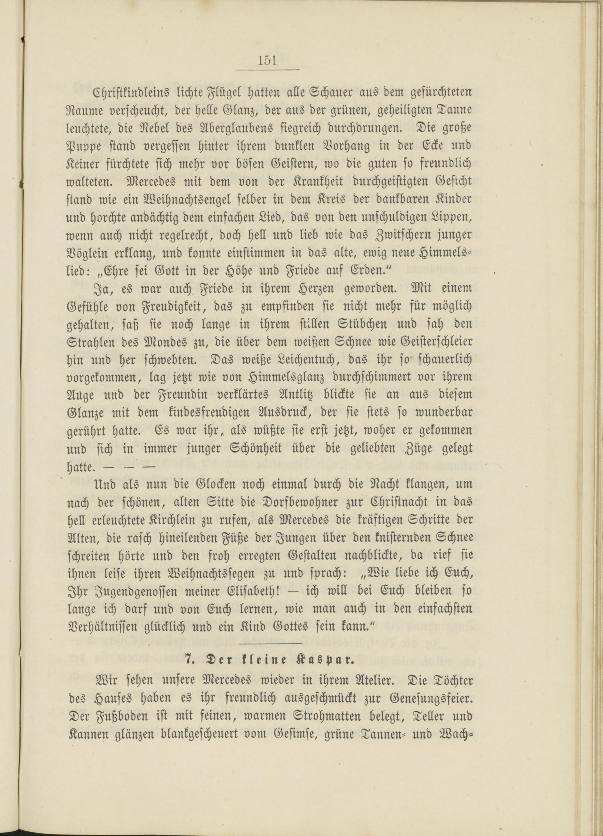 Christkindleins lichte Flügel hatten alle Schauer aus dem gefurchtsten Raume verscheucht, der helle Glanz, der aus der grünen, geheiligten Tanne leuchtete, die Nebel des Aberglaubens siegreich durchdrungen. Die große Puppe stand vergessen hinter ihrem dunklen Vorhang in der Ecke und Keiner fürchtete sich mehr vor bösen Geistern, wo die guten so freundlich walteten. Mercedes mit dem von der Krankheit durchgeistigten Gesicht stand wie ein Weihnachtsengel selber in dem Kreis der dankbaren Kinder und horchte andächtig dem einfachen Lied, das von den unschuldigen Lippen, wenn auch nicht regelrecht, doch hell und lieb wie das Zwitschern junger Vöglein erklang, und konnte einstimmen in das alte, ewig neue Himmelslied: „Ehre sei Gott in der Höhe und Friede aus Erden."