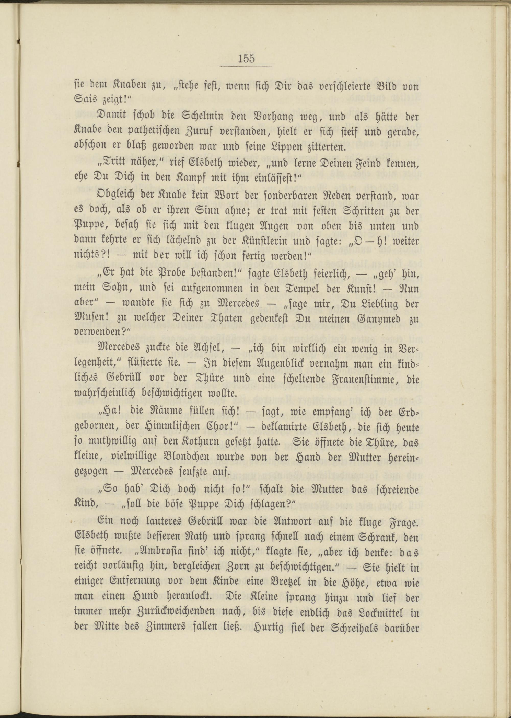 „Er hat die Probe bestanden!" sagte Elsbeth feierlich, — „geh' hin, mein Sohn, und sei aufgenommen in den Tempel der Kunst! — Nun aber" — wandte sie sich zu Mercedes — „sage mir, Du Liebling der Musen! zu welcher Deiner Thaten gedenkest Du meinen Ganymed zu verwenden?"