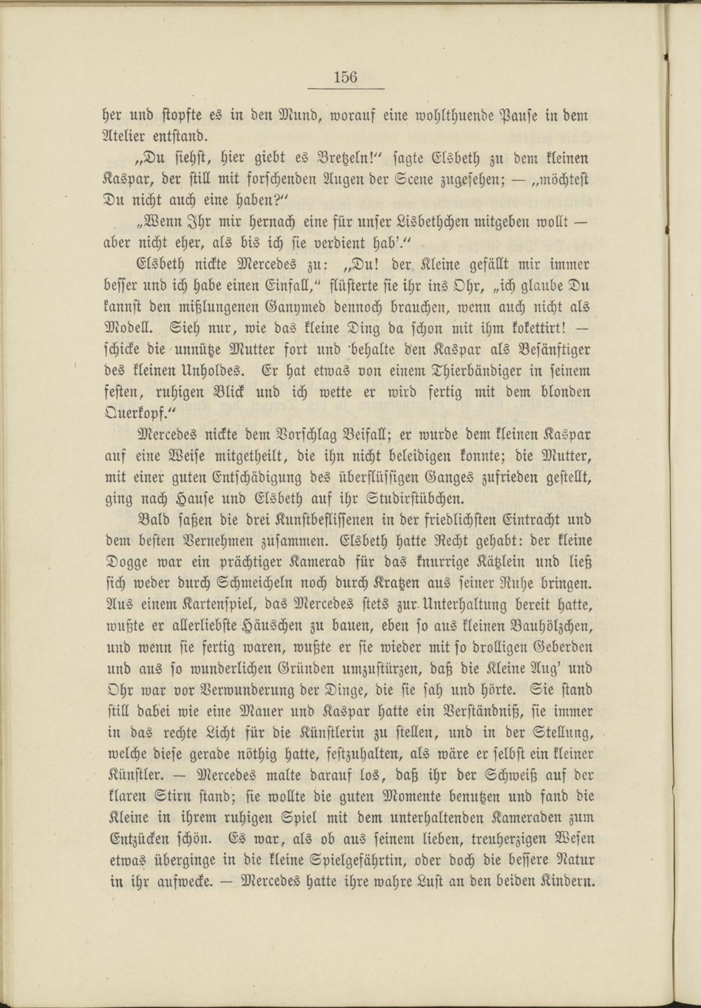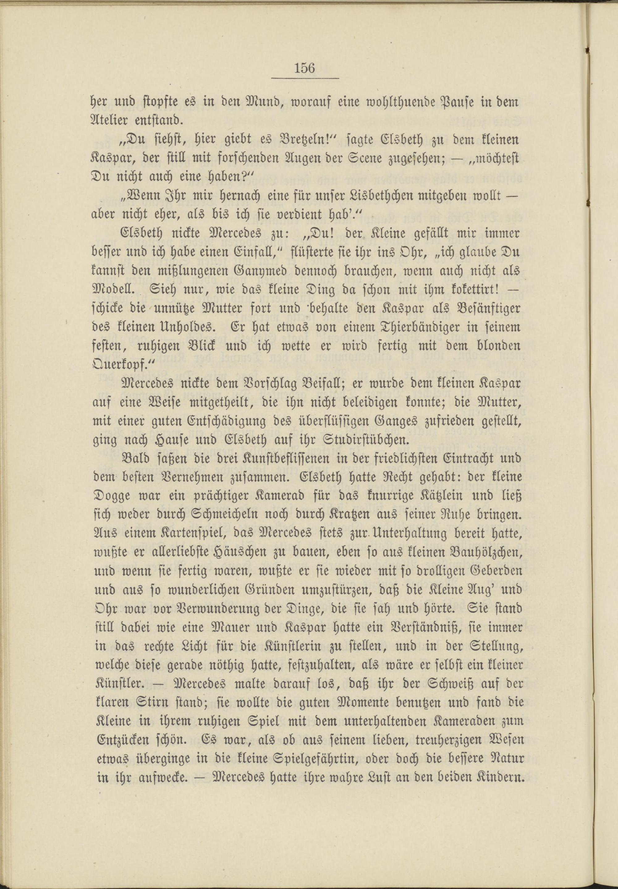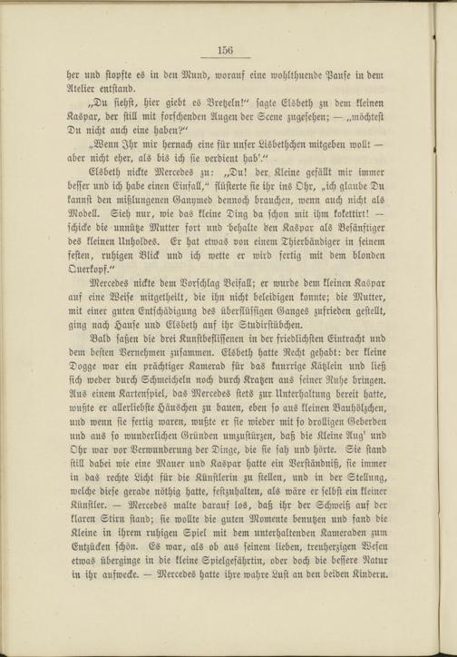 Bald saßen die drei Kunstbeflissenen in der friedlichsten Eintracht und dem besten Vernehmen zusammen. Elsbeth hatte Recht gehabt: der kleine Dogge war ein prächtiger Kamerad für das knurrige Kätzlein und ließ sich weder durch Schmeicheln noch durch Kratzen aus seiner Ruhe bringen. Aus einem Kartenspiel, das Mercedes stets zur Unterhaltung bereit hatte, wußte er allerliebste Häuschen zu bauen, eben so aus kleinen Bauhölzchen, und wenn sie fertig waren, wußte er sie wieder mit so drolligen Geberden und aus so wunderlichen Gründen umzustürzen, daß die Kleine Aug' und Ohr war vor Verwunderung der Dinge, die sie sah und hörte. Sie stand still dabei wie eine Mauer und Kaspar hatte ein Verständniß, sie immer in das rechte Licht für die Künstlerin zu stellen, und in der Stellung, welche diese gerade nöthig hatte, festzuhalten, als wäre er selbst ein kleiner Künstler. — Mercedes malte darauf los, daß ihr der Schweiß auf der klaren Stirn stand; sie wollte die guten Momente benutzen und fand die Kleine in ihrem ruhigen Spiel mit dem unterhaltenden Kameraden zum Entzücken schön. Es war, als ob aus seinem lieben, treuherzigen Wesen etwas überginge in die kleine Spielgefährtin, oder doch die bessere Natur in ihr aufwecke. — Mercedes hatte ihre wahre Lust an den beiden Kindern.