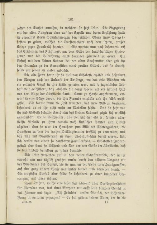 rakter des Dorfes annahm, in welchem sie jetzt lebte. Die Begegnung mit der alten Jungfrau oben auf der Kapelle und deren Erzählung hatte sie veranlaßt ihrem Sonntagmorgen den festlichen Glanz eines Siegesfestes zu geben, welches die Dorfbewohner nach dem letzten, großen Kriege gegen Frankreich feierten. — Sie wartete nun noch besonders auf das Erscheinen des Frühlings, um dem Bilde den landschaftlichen Hintergrund und die Beleuchtung eines sonnigen Himmels zu geben. Ein Besuch mit dem kleinen Kaspar bei der alten Großmutter aber gab ihr den Gedanken zu der Komposition eines zweiten Bildes, das sie abwechselnd mit jenem zu malen gedachte.