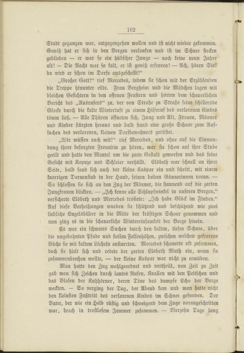 „Großer Gott!" rief Mercedes, indem sie schon mit der Erzählenden die Treppe hinunter eilte. Frau Bergheim und die Mädchen lagen mit bleichen Gesichtern in den offenen Fenstern und hörten dem schauerlichen Bericht des „Ausrufers" zu, der von Straße zu Straße seine schillernde Glocke durch die kalte Winterluft zu einem Hilferuf des verlorenen Kindes tönen ließ. — Alle Thüren öffneten sich, Jung und Alt, Frauen, Männer und Kinder stürzten heraus und bald stand eine große Schaar zum Aufsuchen des verlorenen, kleinen Dorfbewohners gerüstet.