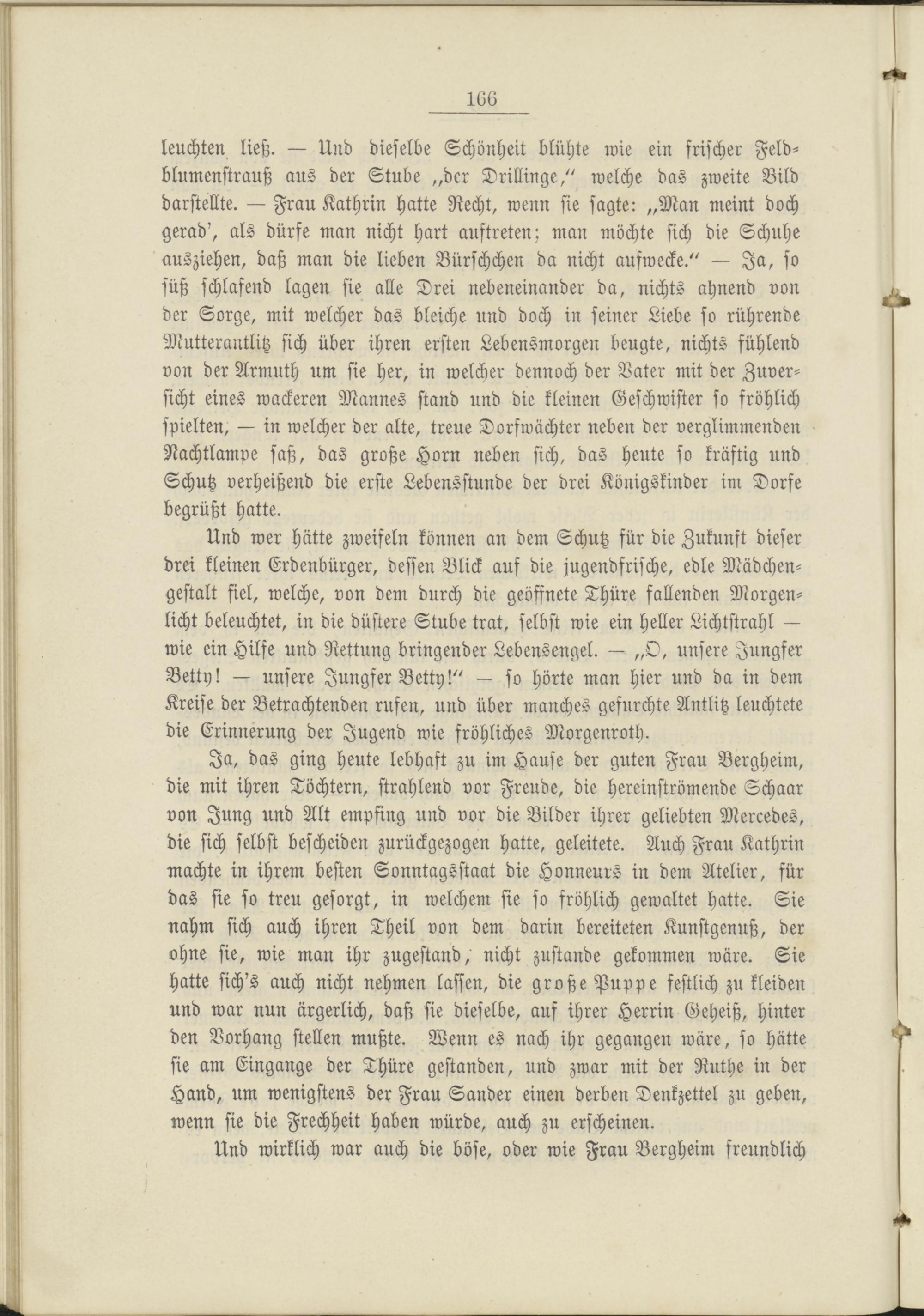 Und wer hätte zweifeln können an dem Schutz für die Zukunft dieser drei kleinen Erdenbürger, dessen Blick auf die jugendfrische, edle Mädchengestalt fiel, welche, von dem durch die geöffnete Thüre fallenden Morgenlicht beleuchtet, in die düstere Stube trat, selbst wie ein Heller Lichtstrahl — wie ein Hilfe und Rettung bringender Lebensengel. — „O, unsere Jungfer Betty! — unsere Jungfer Betty!" — so hörte man hier und da in dem Kreise der Betrachtenden rufen, und über manches gefurchte Antlitz leuchtete die Erinnerung der Jugend wie fröhliches Morgenroth.
