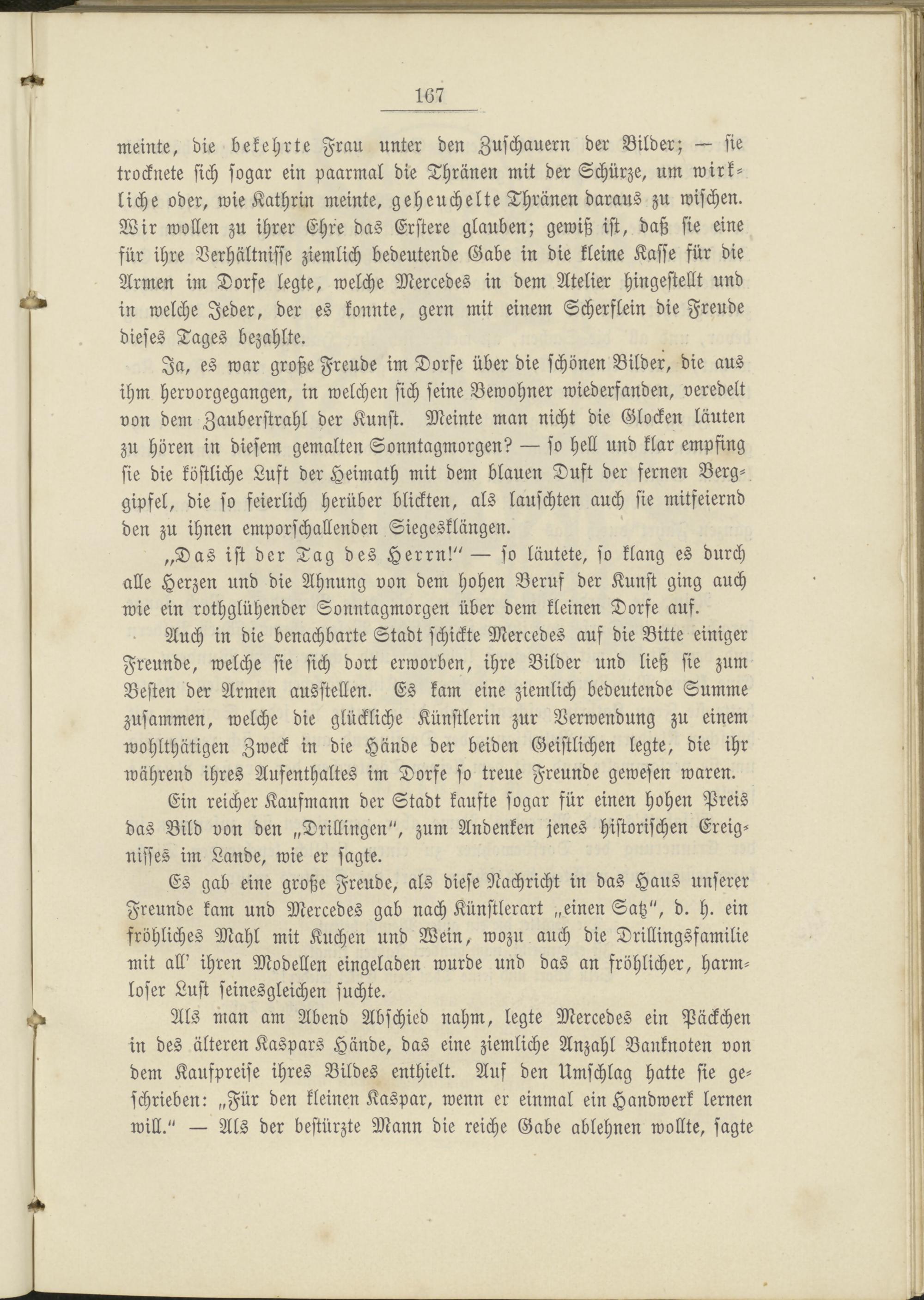 Auch in die benachbarte Stadt schickte Mercedes auf die Bitte einiger Freunde, welche sie sich dort erworben, ihre Bilder und ließ sie zum Besten der Armen ausstellen. Es kam eine ziemlich bedeutende Summe zusammen, welche die glückliche Künstlerin zur Verwendung zu einem wohlthätigen Zweck in die Hände der beiden Geistlichen legte, die ihr während ihres Aufenthaltes im Dorfe so treue Freunde gewesen waren.