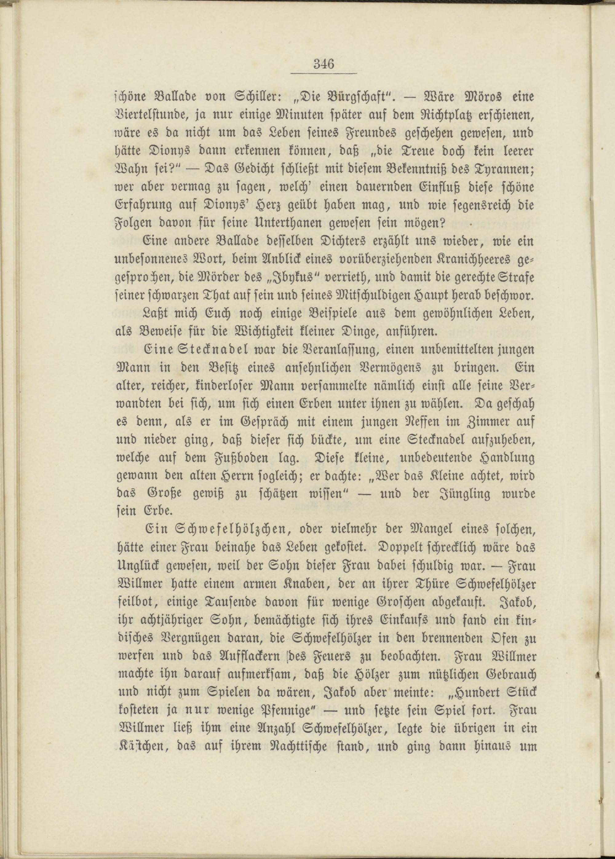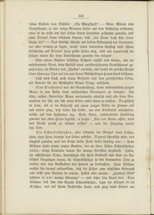 schöne Ballade von Schiller: „Die Bürgschaft". — Wäre Möros eine Viertelstunde, ja nur einige Minuten später auf dem Richtplatz erschienen, wäre es da nicht um das Leben seines Freundes geschehen gewesen, und hätte Dionys dann erkennen können, daß „die Treue doch kein leerer Wahn sei?" — Das Gedicht schließt mit diesem Bekenntniß des Tyrannen; wer aber vermag zu sagen, welch' einen dauernden Einfluß diese schöne Erfahrung auf Dionys' Herz geübt haben mag, und wie segensreich die Folgen davon für seine Unterthanen gewesen sein mögen?