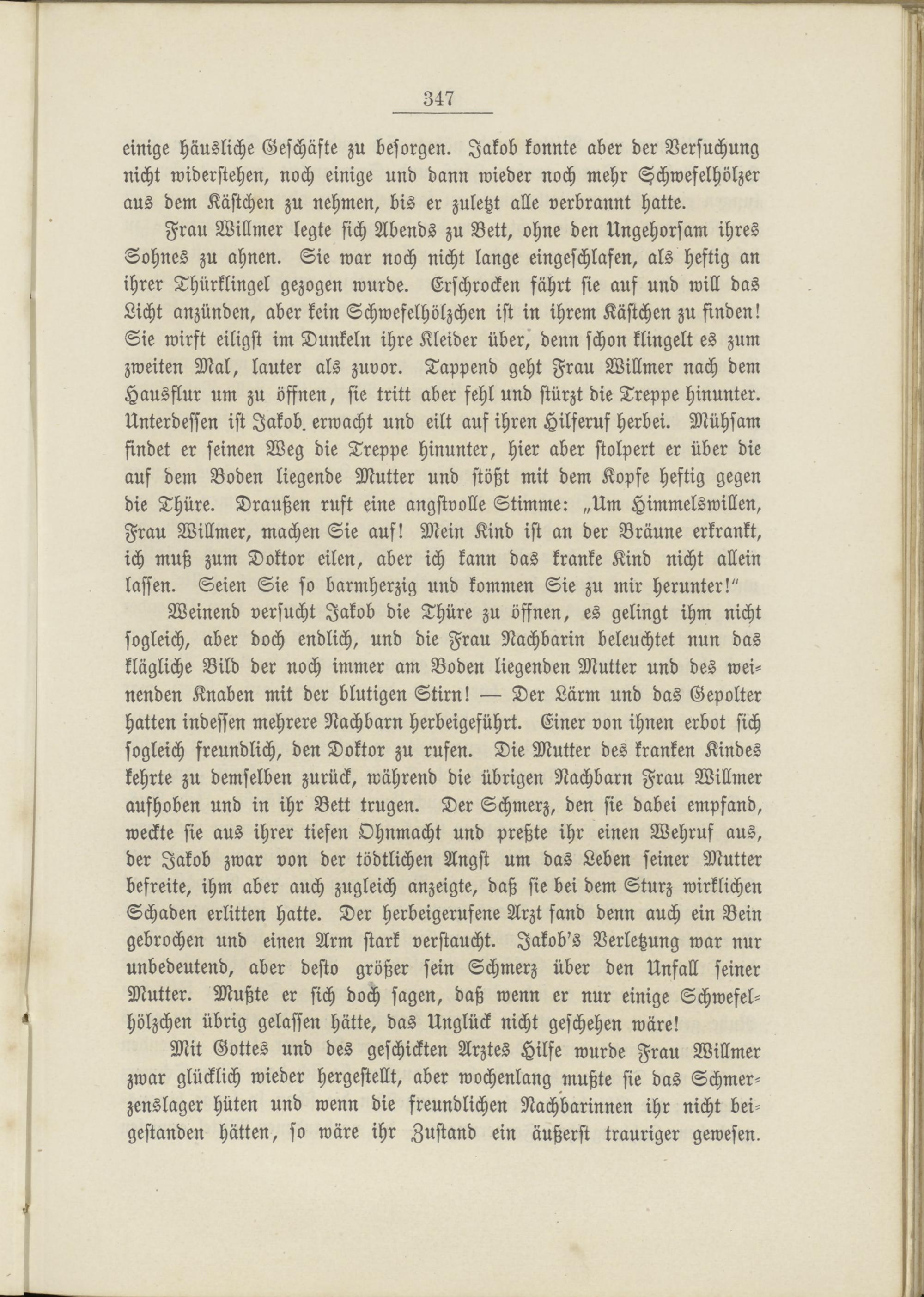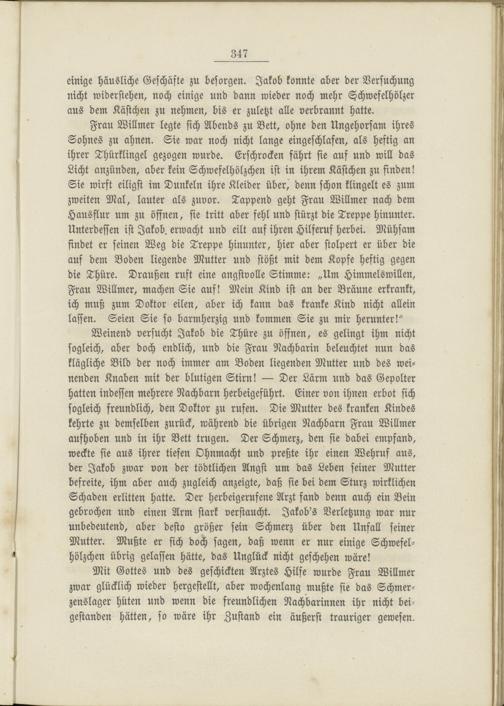 Weinend versucht Jakob die Thüre zu öffnen, es gelingt ihm nicht sogleich, aber doch endlich, und die Frau Nachbarin beleuchtet nun das klägliche Bild der noch immer am Boden liegenden Mutter und des weinenden Knaben mit der blutigen Stirn! — Der Lärm und das Gepolter hatten indessen mehrere Nachbarn herbeigeführt. Einer von ihnen erbot sich sogleich freundlich, den Doktor zu rufen. Die Mutter des kranken Kindes kehrte zu demselben zurück, während die übrigen Nachbarn Frau Willmer aufhoben und in ihr Bett trugen. Der Schmerz, den sie dabei empfand, weckte sie aus ihrer tiefen Ohnmacht und preßte ihr einen Wehruf aus, der Jakob zwar von der tödtlichen Angst um das Leben seiner Mutter befreite, ihm aber auch zugleich anzeigte, daß sie bei dem Sturz wirklichen Schaden erlitten hatte. Der herbeigerufene Arzt fand denn auch ein Bein gebrochen und einen Arm stark verstaucht. Jakob's Verletzung war nur unbedeutend, aber desto größer sein Schmerz über den Unfall seiner Mutter. Mußte er sich doch sagen, daß wenn er nur einige Schwefelhölzchen übrig gelassen hätte, das Unglück nicht geschehen wäre!