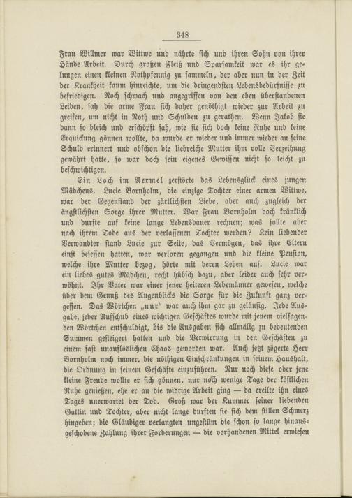 Frau Willmer war Wittwe und nährte sich und ihren Sohn von ihrer Hände Arbeit. Durch großen Fleiß und Sparsamkeit war es ihr gelungen einen kleinen Nothpfennig zu sammeln, der aber nun in der Zeit der Krankheit kaum hinreichte, um die dringendsten Lebensbedürfnisse zu befriedigen. Noch schwach und angegriffen von den eben überstandenen Leiden, sah die arme Frau sich daher genöthigt wieder zur Arbeit zu greifen, um nicht in Noth und Schulden zu gerathen. Wenn Jakob sie dann so bleich und erschöpft sah, wie sie sich doch keine Ruhe und keine Erquickung gönnen wollte, da wurde er wieder und immer wieder an seine Schuld erinnert und obschon die liebreiche Mutter ihm volle Verzeihung gewährt hatte, so war doch sein eigenes Gewissen nicht so leicht zu beschwichtigen.