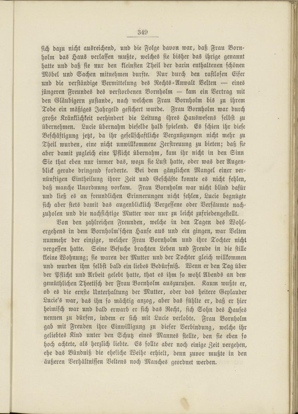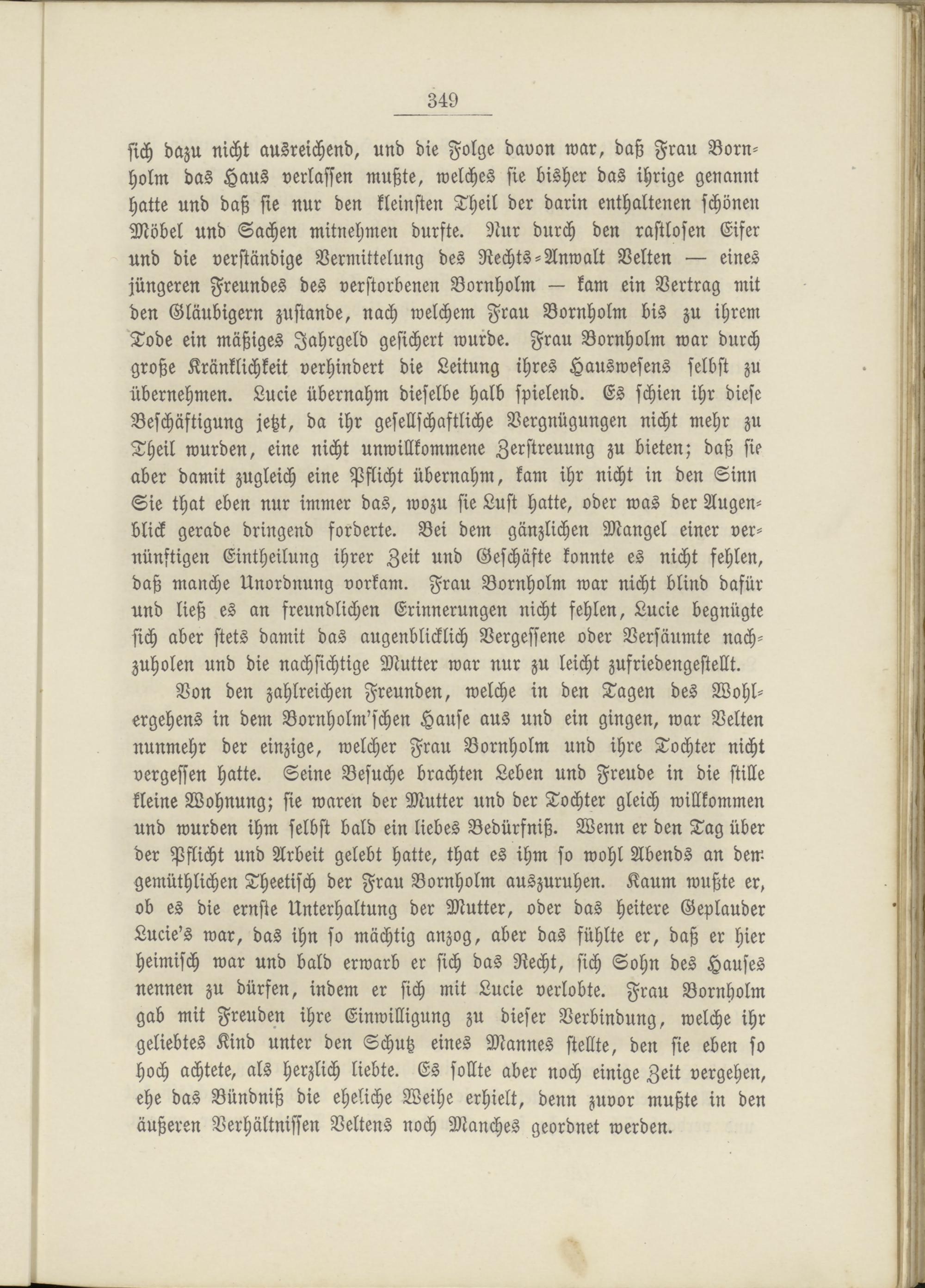Von den zahlreichen Freunden, welche in den Tagen des Wohlergehens in dem Bornholm'schen Hause aus und ein gingen, war Velten nunmehr der einzige, welcher Frau Bornholm und ihre Tochter nicht vergessen hatte. Seine Besuche brachten Leben und Freude in die stille kleine Wohnung; sie waren der Mutter und der Tochter gleich willkommen und wurden ihm selbst bald ein liebes Bedürfniß. Wenn er den Tag über der Pflicht und Arbeit gelebt hatte, that es ihm so wohl Abends an dem gemüthlichen Theetisch der Frau Bornholm auszuruhen. Kaum wußte er, ob es die ernste Unterhaltung der Mutter, oder das heitere Geplauder Lucie's war, das ihn so mächtig anzog, aber das fühlte er, daß er hier heimisch war und bald erwarb er sich das Recht, sich Sohn des Hauses nennen zu dürfen, indem er sich mit Lucie verlobte. Frau Bornholm gab mit Freuden ihre Einwilligung zu dieser Verbindung, welche ihr geliebtes Kind unter den Schutz eines Mannes stellte, den sie eben so hoch achtete, als herzlich liebte. Es sollte aber noch einige Zeit vergehen, ehe das Bündniß die eheliche Weihe erhielt, denn zuvor mußte in den äußeren Verhältnissen Veltens noch Manches geordnet werden.