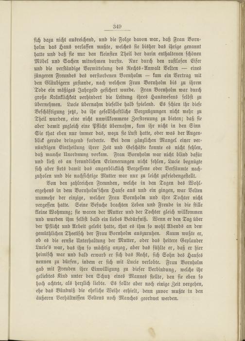 sich dazu nicht ausreichend, und die Folge davon war, daß Frau Bornholm das Haus verlassen mußte, welches sie bisher das ihrige genannt hatte und daß sie nur den kleinsten Theil der darin enthaltenen schönen Möbel und Sachen mitnehmen durfte. Nur durch den rastlosen Eifer und die verständige Vermittelung des Rechts-Anwalt Velten — eines jüngeren Freundes des verstorbenen Bornholm — kam ein Vertrag mit den Gläubigern zustande, nach welchem Frau Bornholm bis zu ihrem Tode ein mäßiges Jahrgeld gesichert wurde. Frau Bornholm war durch große Kränklichkeit verhindert die Leitung ihres Hauswesens selbst zu übernehmen. Lucie übernahm dieselbe halb spielend. Es schien ihr diese Beschäftigung jetzt, da ihr gesellschaftliche Vergnügungen nicht mehr zu Theil wurden, eine nicht unwillkommene Zerstreuung zu bieten; daß sie aber damit zugleich eine Pflicht übernahm, kam ihr nicht in den Sinn Sie that eben nur immer das, wozu sie Lust hatte, oder was der Augenblick gerade dringend forderte. Bei dem gänzlichen Mangel einer vernünftigen Eintheilung ihrer Zeit und Geschäfte konnte es nicht fehlen, daß manche Unordnung vorkam. Frau Bornholm war nicht blind dafür und ließ es an freundlichen Erinnerungen nicht fehlen, Lucie begnügte sich aber stets damit das augenblicklich Vergessene oder Versäumte nachzuholen und die nachsichtige Mutter war nur zu leicht zufriedengestellt.