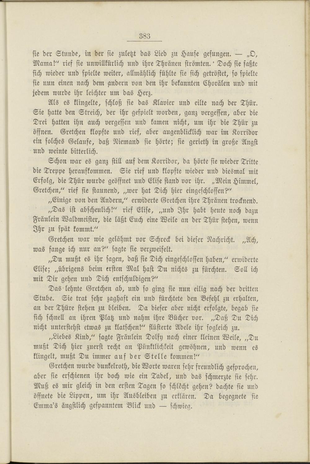Als es klingelte, schloß sie das Klavier und eilte nach der Thür. Sie hatte den Streich, der ihr gespielt worden, ganz vergessen, aber die Drei hatten ihn auch vergessen und kamen nicht, um ihr die Thür zu öffnen. Gretchen klopfte und rief, aber augenblicklich war im Korridor ein solches Gelaufe, daß Niemand sie hörte; sie gerieth in große Angst und weinte bitterlich.