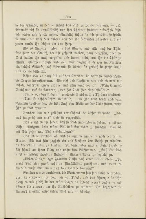 „Das ist abscheulich!" rief Elise, „und Ihr habt heute noch dazu Fräulein Waldmeister, die läßt Euch eine Weile an der Thür stehen, wenn Ihr zu spät kommt."