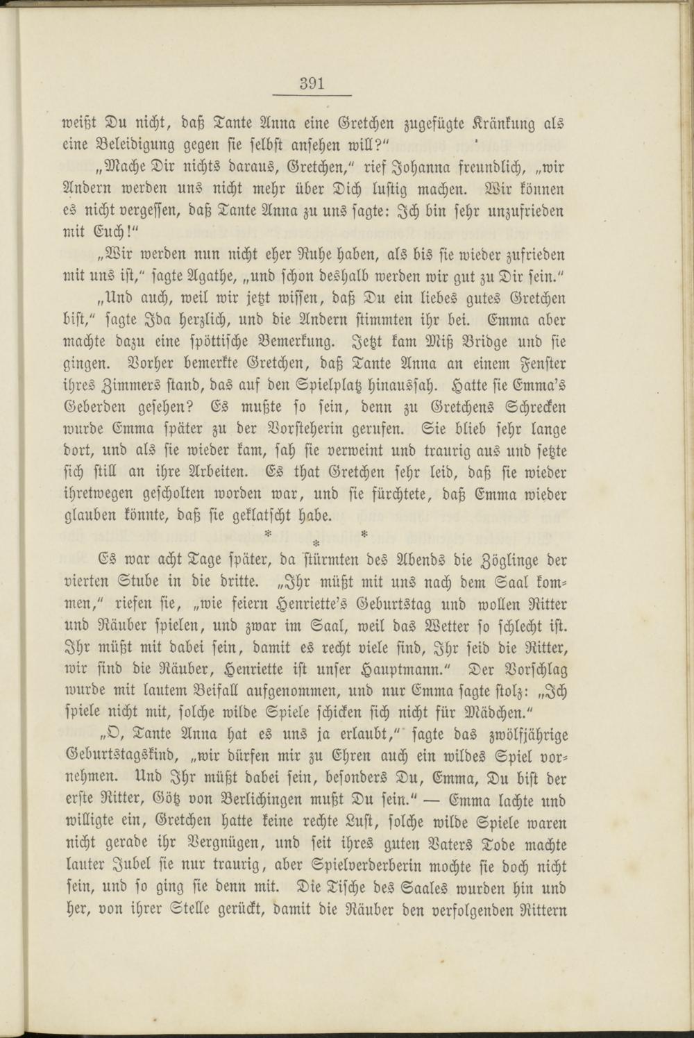 „O, Tante Anna hat es uns ja erlaubt,"' sagte das zwölfjährige Geburtstagskind, „wir dürfen mir zu Ehren auch ein wildes Spiel vornehmen. Und Ihr müßt dabei sein, besonders Du, Emma, Du bist der erste Ritter, Götz von Berlichingen mußt Du sein." — Emma lachte und willigte ein, Gretchen hatte keine rechte Lust, solche wilde Spiele waren nicht gerade ihr Vergnügen, und seit ihres guten Vaters Tode machte lauter Jubel sie nur traurig, aber Spielverderberin mochte sie doch nicht sein, und so ging sie denn mit. Die Tische des Saales wurden hin und her, von ihrer Stelle gerückt, damit die Räuber den verfolgenden Rittern