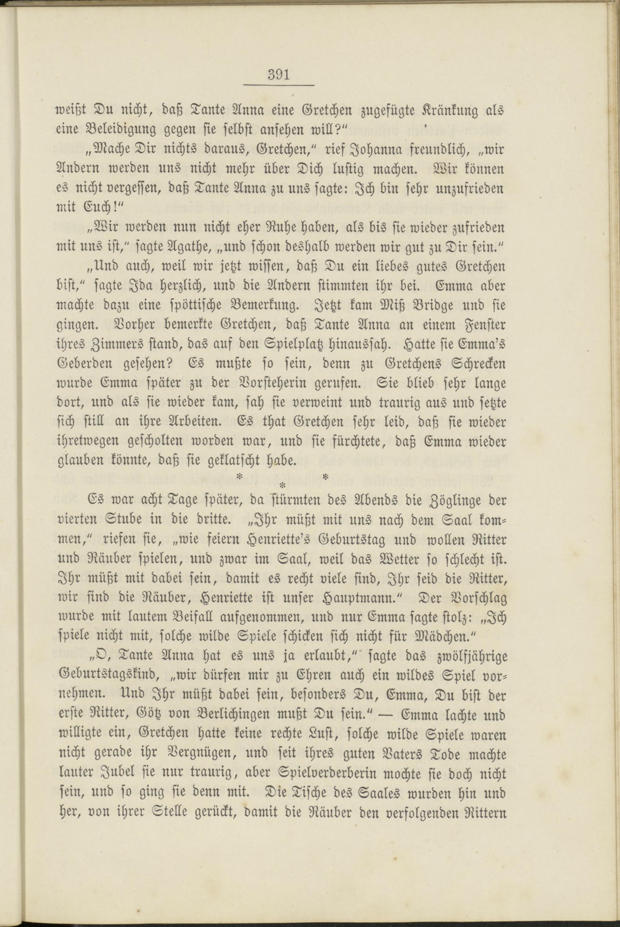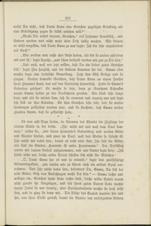 Es war acht Tage später, da stürmten des Abends die Zöglinge der vierten Stube in die dritte. „Ihr müßt mit uns nach dem Saal kommen," riefen sie, „wie feiern Henriette's Geburtstag und wollen Ritter und Räuber spielen, und zwar im Saal, weil das Wetter so schlecht ist. Ihr müßt mit dabei sein, damit es recht viele sind, Ihr seid die Ritter, wir sind die Räuber, Henriette ist unser Hauptmann." Der Vorschlag wurde mit lautem Beifall aufgenommen, und nur Emma sagte stolz: „Ich spiele nicht mit, solche wilde Spiele schicken sich nicht für Mädchen."