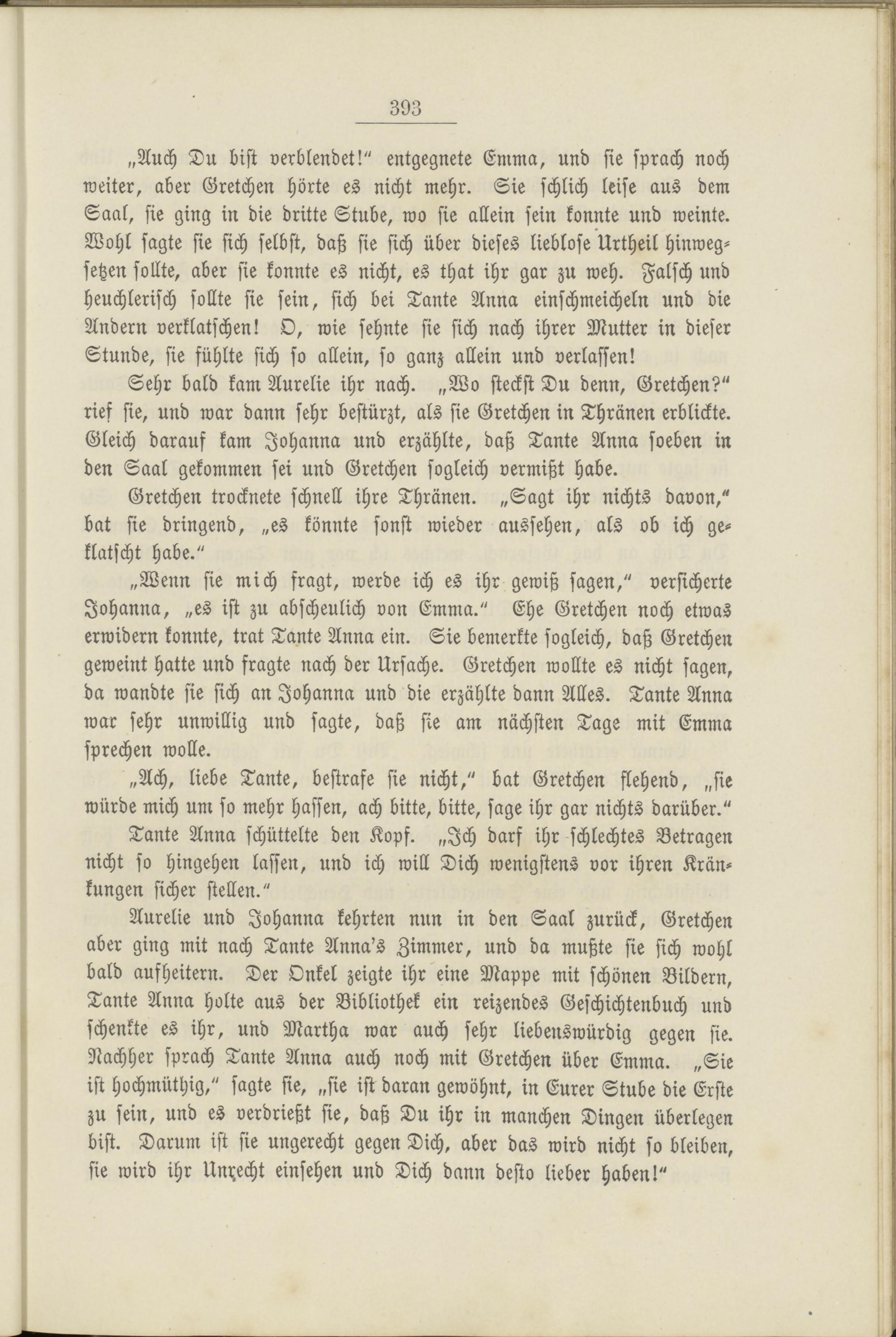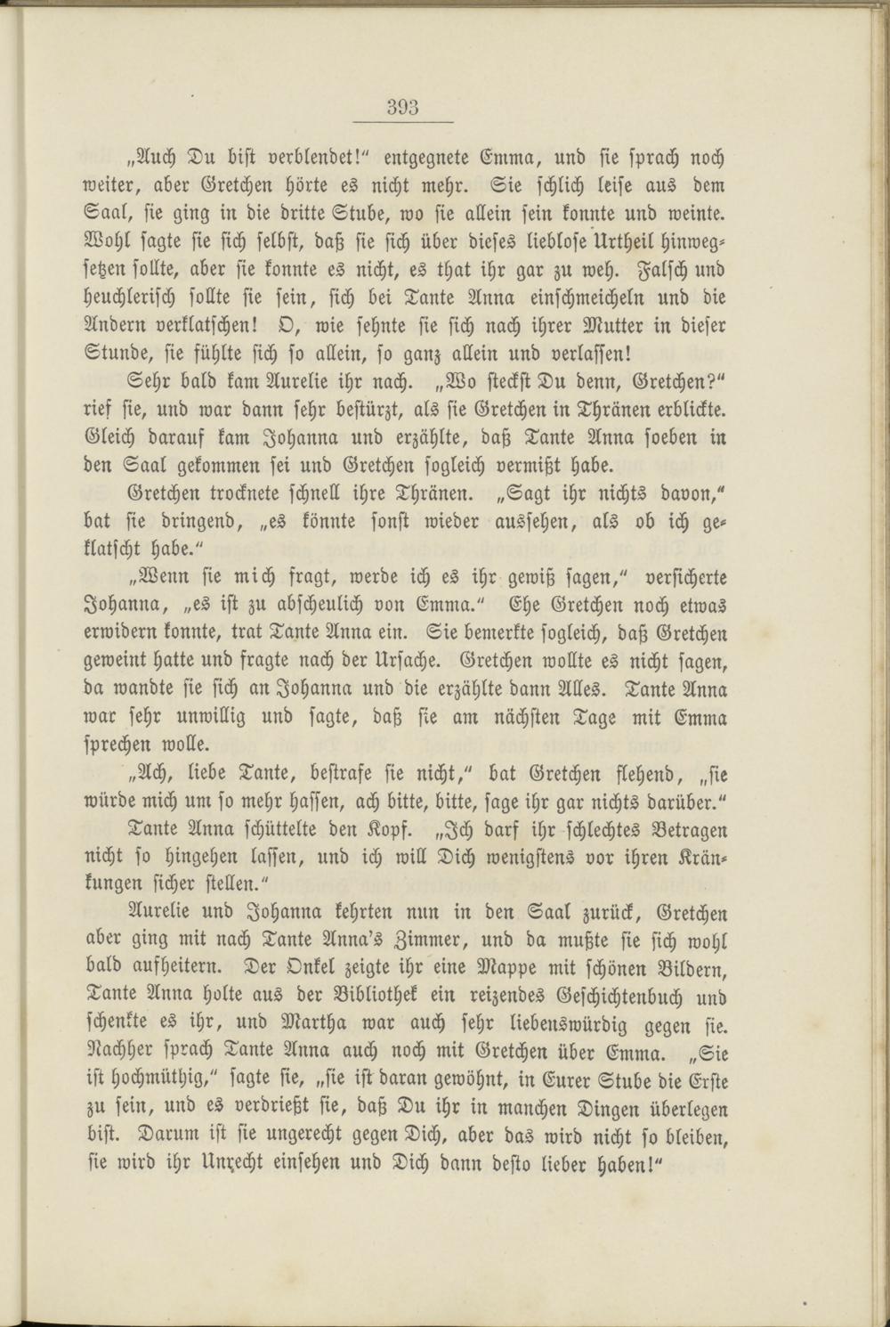 Sehr bald kam Aurelie ihr nach. „Wo steckst Du denn, Gretchen?" rief sie, und war dann sehr bestürzt, als sie Gretchen in Thränen erblickte. Gleich darauf kam Johanna und erzählte, daß Tante Anna soeben in den Saal gekommen sei und Gretchen sogleich vermißt habe.