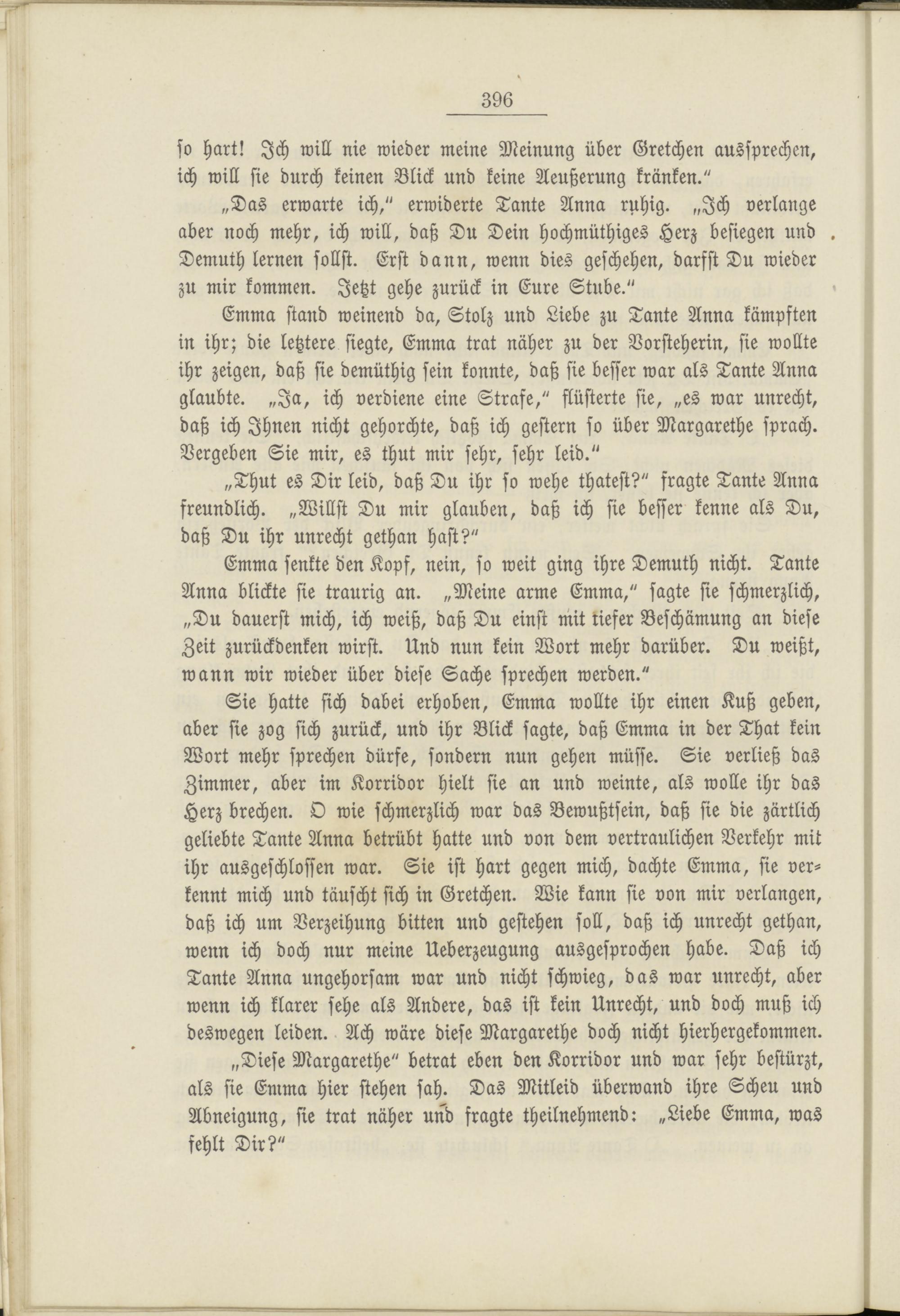 Emma stand weinend da, Stolz und Liebe zu Tante Anna kämpften in ihr; die letztere siegte, Emma trat näher zu der Vorsteherin, sie wollte ihr zeigen, daß sie demüthig sein konnte, daß sie besser war als Tante Anna glaubte. „Ja, ich verdiene eine Strafe," flüsterte sie, „es war unrecht, daß ich Ihnen nicht gehorchte, daß ich gestern so über Margarethe sprach. Vergeben Sie mir, es thut mir sehr, sehr leid."