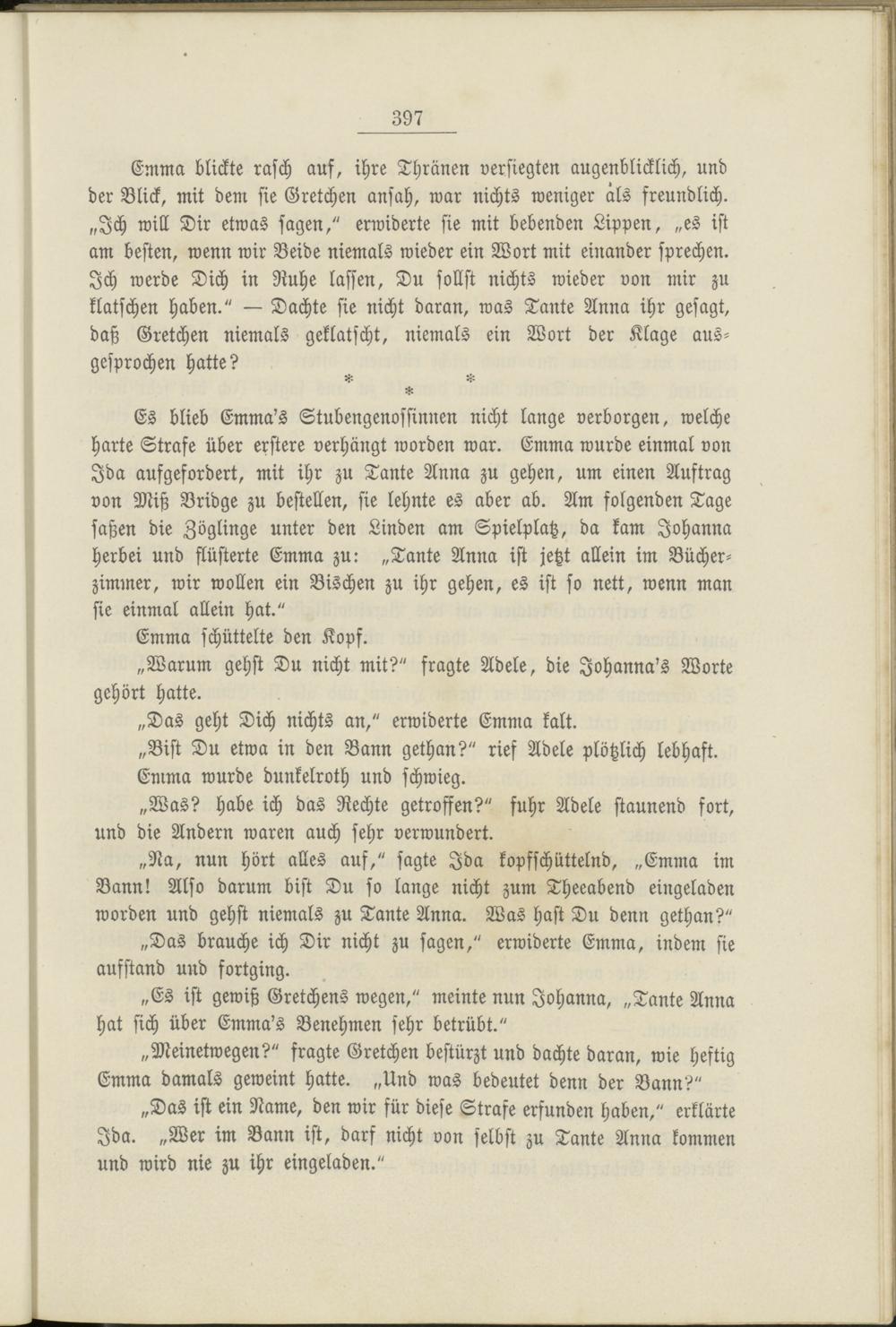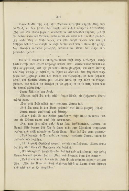 Es blieb Emma's Stubengenossinnen nicht lange verborgen, welche harte Strafe über erstere verhängt worden war. Emma wurde einmal von Jda aufgefordert, mit ihr zu Tante Anna zu gehen, um einen Auftrag von Miß Bridge zu bestellen, sie lehnte es aber ab. Am folgenden Tage saßen die Zöglinge unter den Linden am Spielplatz, da kam Johanna herbei und flüsterte Emma zu: „Tante Anna ist jetzt allein im Bücherzimmer, wir wollen ein Bischen zu ihr gehen, es ist so nett, wenn man sie einmal allein hat."