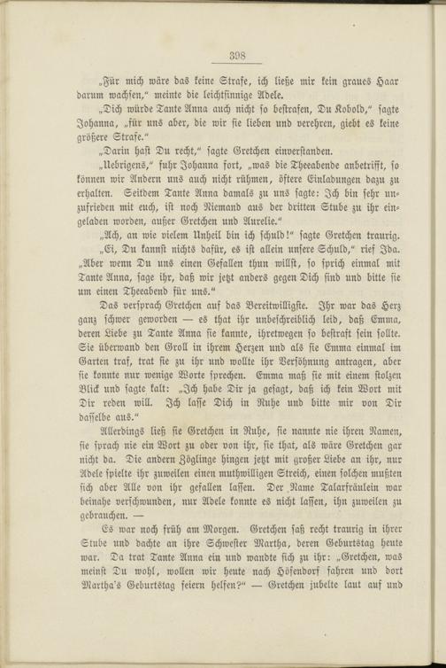 „Uebrigens," fuhr Johanna fort, „was die Theeabende anbetrifft, so können wir Andern uns auch nicht rühmen, öftere Einladungen dazu zu erhalten. Seitdem Tante Anna damals zu uns sagte: Ich bin sehr unzufrieden mit euch, ist noch Niemand aus der dritten Stube zu ihr eingeladen worden, außer Gretchen und Aurelie."