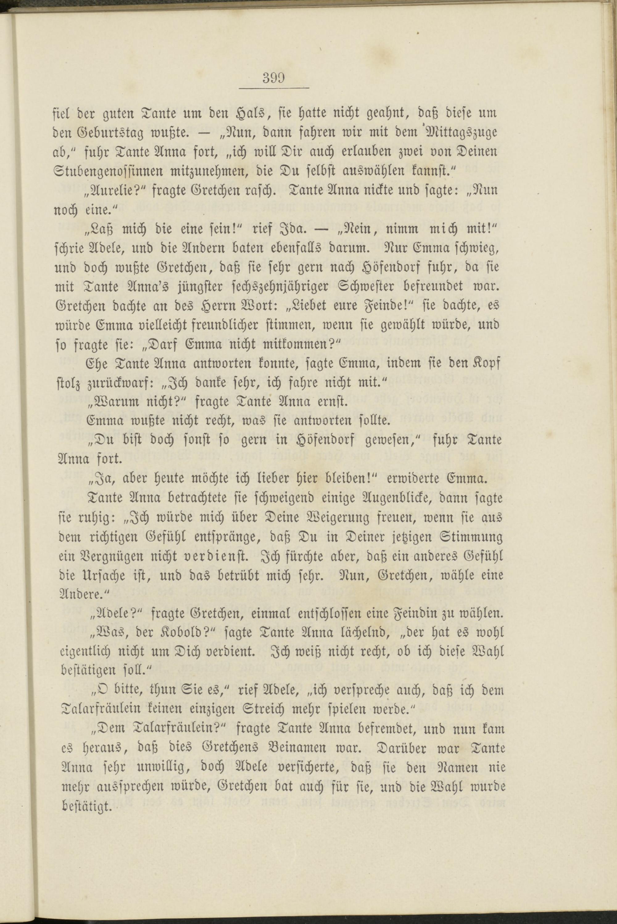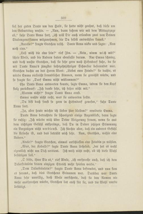 „Dem Talarfräulein?" fragte Tante Anna befremdet, und nun kam es heraus, daß dies Gretchens Beinamen war. Darüber war Tante Anna sehr unwillig, doch Adele versicherte, daß sie den Namen nie mehr aussprechen würde, Gretchen bat auch für sie, und die Wahl wurde bestätigt.