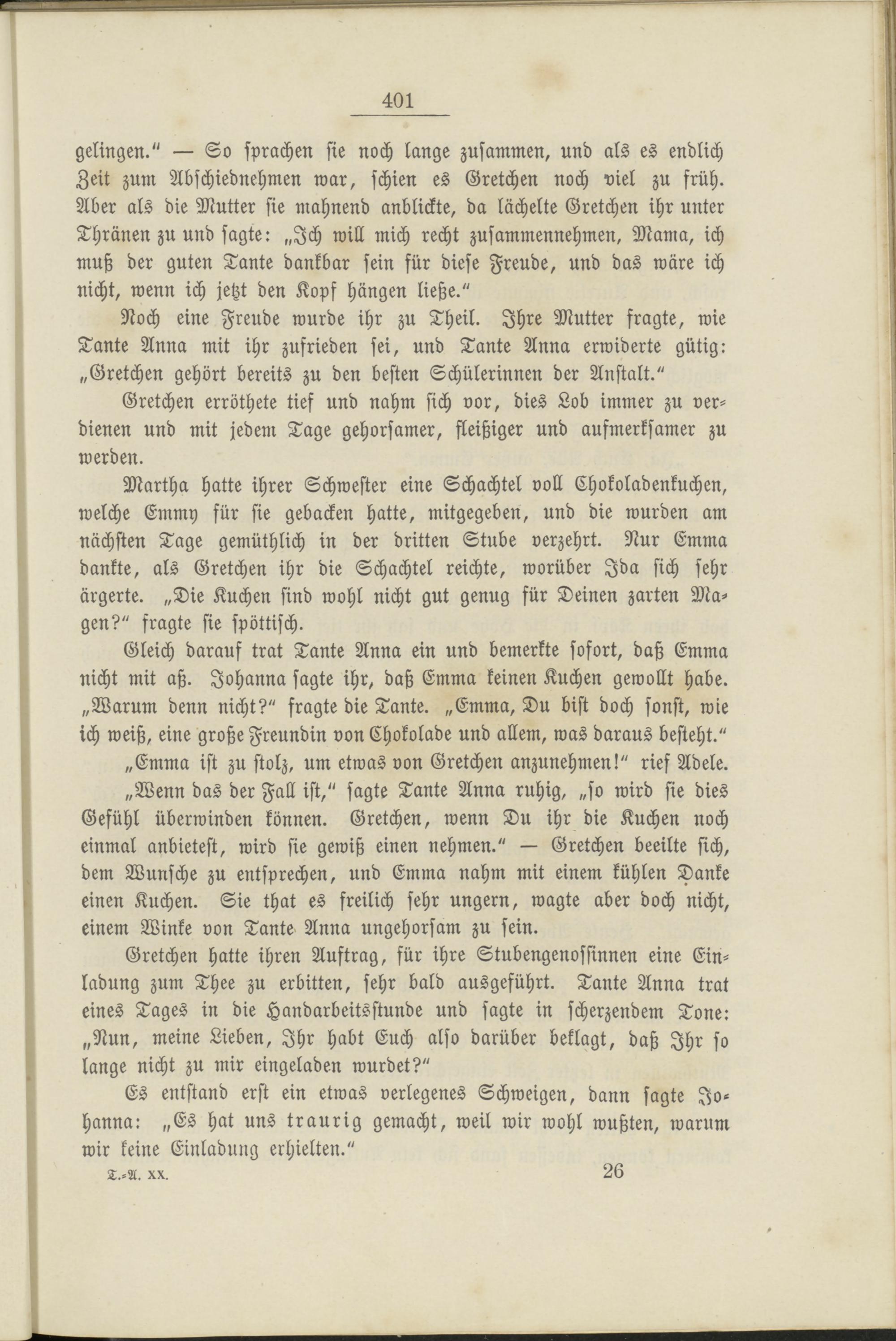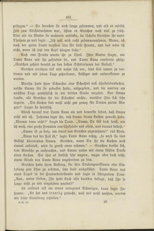Noch eine Freude wurde ihr zu Theil. Ihre Mutter fragte, wie Tante Anna mit ihr zufrieden sei, und Tante Anna erwiderte gütig: „Gretchen gehört bereits zu den besten Schülerinnen der Anstalt."