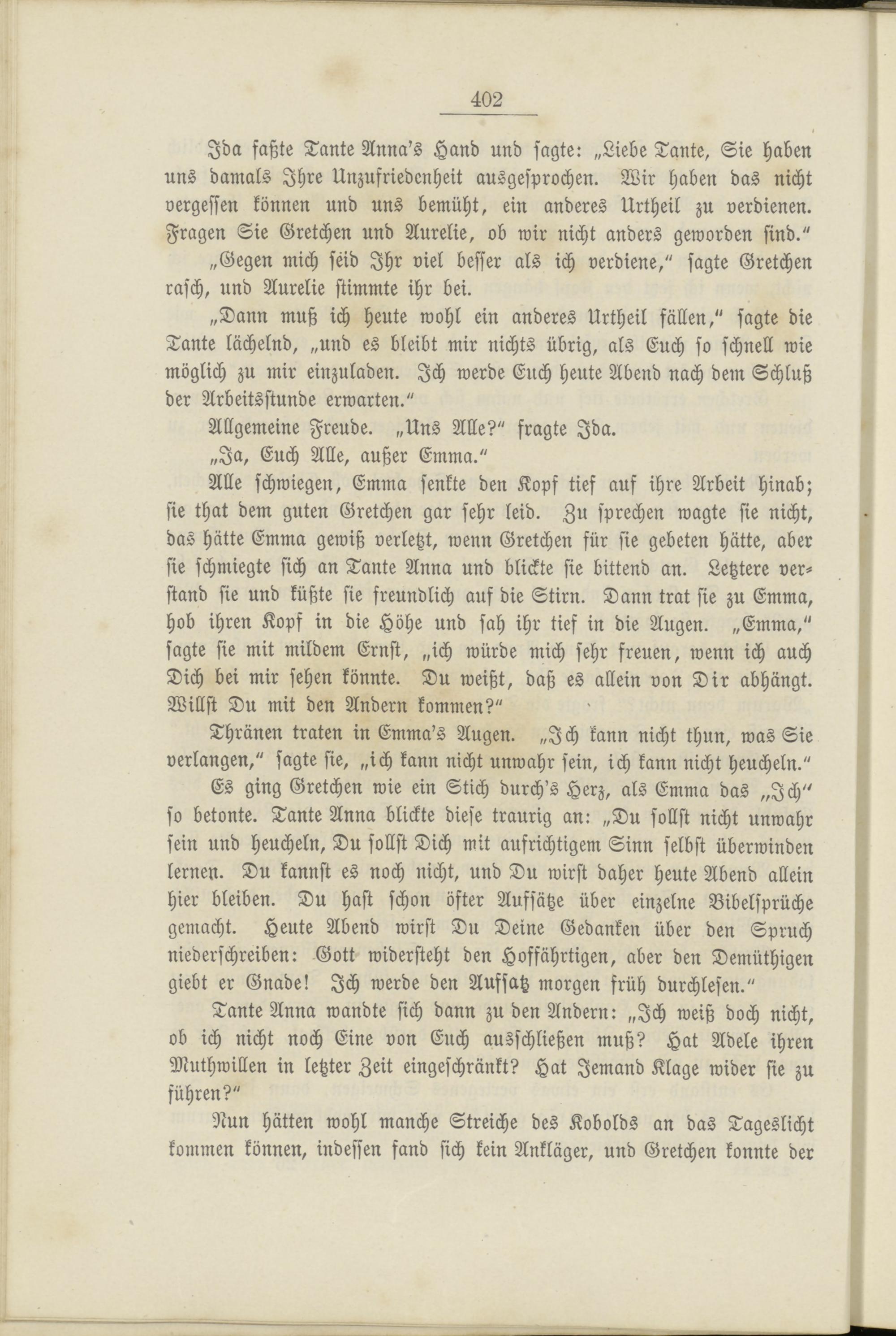 Es ging Gretchen wie ein Stich durch's Herz, als Emma das „Ich" so betonte. Tante Anna blickte diese traurig an: „Du sollst nicht unwahr sein und heucheln, Du sollst Dich mit aufrichtigem Sinn selbst überwinden lernen. Du kannst es noch nicht, und Du wirst daher heute Abend allein hier bleiben. Du hast schon öfter Aufsätze über einzelne Bibelsprüche gemacht. Heute Abend wirst Du Deine Gedanken über den Spruch niederschreiben: Gott widersteht den Hoffährtigen, aber den Demüthigen giebt er Gnade! Ich werde den Aufsatz morgen früh durchlesen."