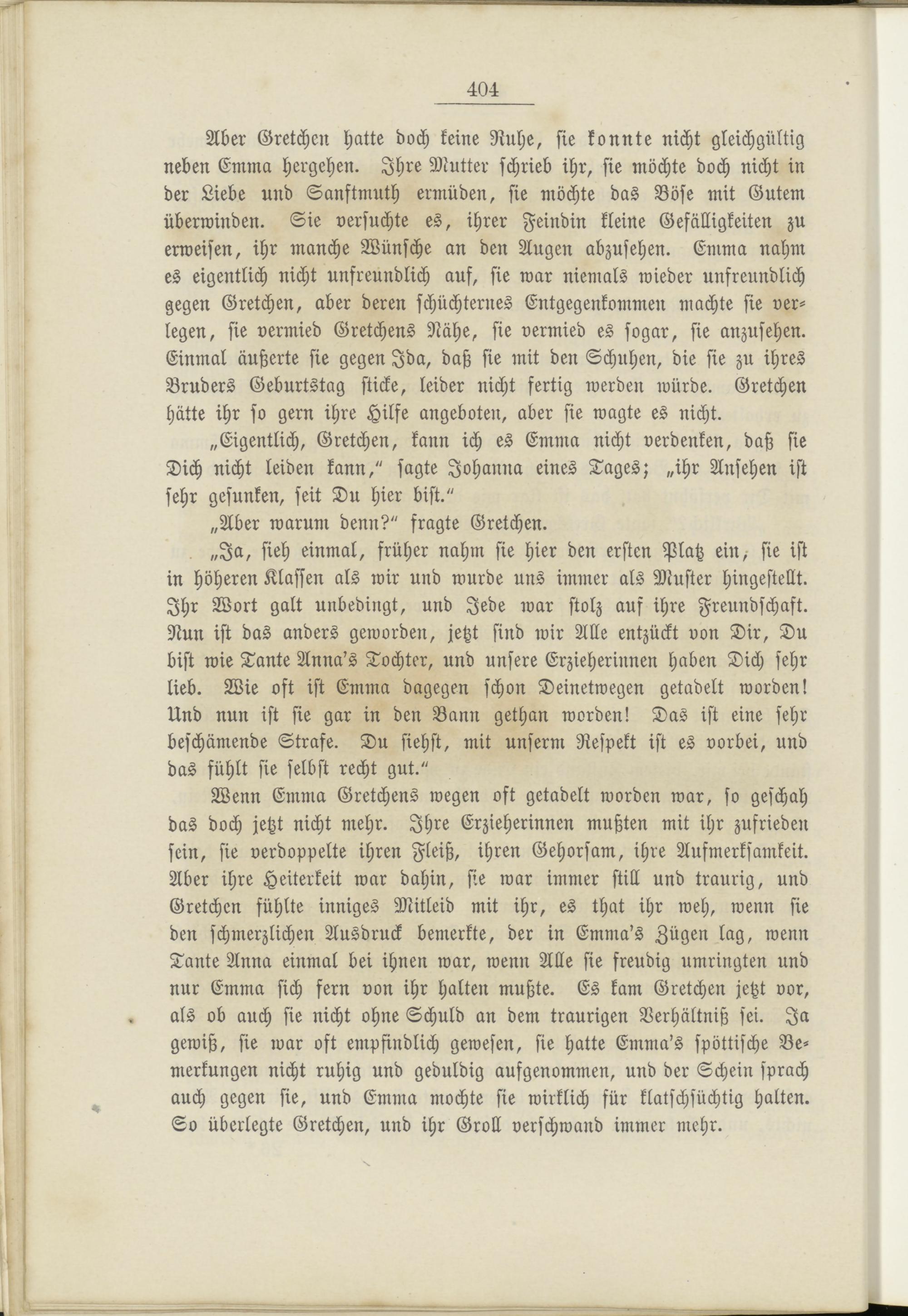 Wenn Emma Gretchens wegen oft getadelt worden war, so geschah das doch jetzt nicht mehr. Ihre Erzieherinnen mußten mit ihr zufrieden sein, sie verdoppelte ihren Fleiß, ihren Gehorsam, ihre Aufmerksamkeit. Aber ihre Heiterkeit war dahin, sie war immer still und traurig, und Gretchen fühlte inniges Mitleid mit ihr, es that ihr weh, wenn sie den schmerzlichen Ausdruck bemerkte, der in Emma's Zügen lag, wenn Tante Anna einmal bei ihnen war, wenn Alle sie freudig umringten und nur Emma sich fern von ihr halten mußte. Es kam Gretchen jetzt vor, als ob auch sie nicht ohne Schuld an dem traurigen Verhältniß sei. Ja gewiß, sie war oft empfindlich gewesen, sie hatte Emma's spöttische Bemerkungen nicht ruhig und geduldig aufgenommen, und der Schein sprach auch gegen sie, und Emma mochte sie wirklich für klatschsüchtig halten. So überlegte Gretchen, und ihr Groll verschwand immer mehr.