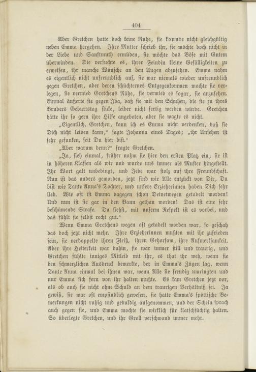 Aber Gretchen hatte doch keine Ruhe, sie konnte nicht gleichgültig neben Emma hergehen. Ihre Mutter schrieb ihr, sie möchte doch nicht in der Liebe und Sanftmuth ermüden, sie möchte das Böse mit Gutem überwinden. Sie versuchte es, ihrer Feindin kleine Gefälligkeiten zu erweisen, ihr manche Wünsche an den Augen abzusehen. Emma nahm es eigentlich nicht unfreundlich aus, sie war niemals wieder unfreundlich gegen Gretchen, aber deren schüchternes Entgegenkommen machte sie verlegen, sie vermied Gretchens Nähe, sie vermied es sogar, sie anzusehen. Einmal äußerte sie gegen Jda, daß sie mit den Schuhen, die sie zu ihres Bruders Geburtstag sticke, leider nicht fertig werden würde. Gretchen hätte ihr so gern ihre Hilfe angeboten, aber sie wagte es nicht.