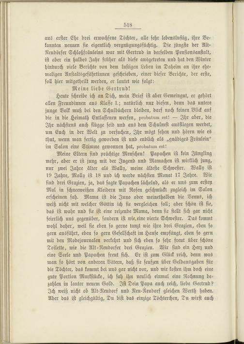 aus erster Ehe drei erwachsene Töchter, alle sehr lebenslustig, ihre Bekannten nennen sie eigentlich vergnügungssüchtig. Die jüngste der Alt- Neudörfer Schloßsräuleins war mit Gertrud in derselben Pensionsanstalt, ist aber ein halbes Jahr früher als diese ausgetreten und hat den Winter hindurch viele Berichte von dem lustigen Leben im Daheim an ihre ehemaligen Anstaltsgefährtinnen geschrieben, einer dieser Berichte, der erste, soll hier mitgetheilt werden, er lautet wie folgt: