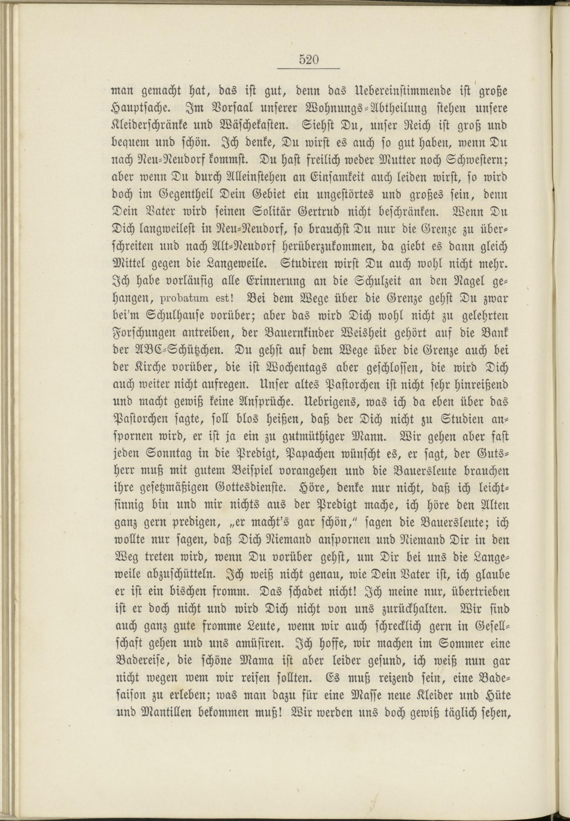 man gemacht hat, das ist gut, denn das Übereinstimmende ist große Hauptsache. Im Vorsaal unserer Wohnungs-Abtheilung stehen unsere Kleiderschränke und Wäschekasten. Siehst Du, unser Reich ist groß und bequem und schön. Ich denke, Du wirst es auch so gut haben, wenn Du nach Neu-Neudorf kommst. Du hast freilich weder Mutter noch Schwestern; aber wenn Du durch Alleinstehen an Einsamkeit auch leiden wirst, so wird doch im Gegentheil Dein Gebiet ein ungestörtes und großes sein, denn Dein Vater wird seinen Solitär Gertrud nicht beschränken. Wenn Du Dich langweilest in Neu-Neudorf, so brauchst Du nur die Grenze zu überschreiten und nach Alt-Neudorf herüberzukommen, da giebt es dann gleich Mittel gegen die Langeweile. Studiren wirst Du auch wohl nicht mehr. Ich habe vorläufig alle Erinnerung an die Schulzeit an den Nagel gehangen, pi-obatmn 68t! Bei dem Wege über die Grenze gehst Du zwar bei'm Schulhause vorüber; aber das wird Dich wohl nicht zu gelehrten Forschungen antreiben, der Bauernkinder Weisheit gehört auf die Bank der ABC-Schützchen. Du gehst auf dem Wege über die Grenze auch bei der Kirche vorüber, die ist Wochentags aber geschlossen, die wird Dich auch weiter nicht aufregen. Unser altes Pastorchen ist nicht sehr hinreißend und macht gewiß keine Ansprüche. Uebrigens, was ich da eben über das Pastorchen sagte, soll blos heißen, daß der Dich nicht zu Studien anspornen wird, er ist ja ein zu gutmüthiger Mann. Wir gehen aber fast jeden Sonntag in die Predigt, Papachen wünscht es, er sagt, der Gutsherr muß mit gutem Beispiel vorangehen und die Bauersleute brauchen ihre gesetzmäßigen Gottesdienste. Höre, denke nur nicht, daß ich leichtsinnig bin und mir nichts aus der Predigt mache, ich höre den Alten ganz gern predigen, „er macht's gar schön," sagen die Bauersleute; ich wollte nur sagen, daß Dich Niemand anspornen und Niemand Dir in den Weg treten wird, wenn Du vorüber gehst, um Dir bei uns die Langeweile abzuschütteln. Ich weiß nicht genau, wie Dein Vater ist, ich glaube er ist ein bischen fromm. Das schadet nicht! Ich meine nur, übertrieben ist er doch nicht und wird Dich nicht von uns zurückhalten. Wir sind auch ganz gute fromme Leute, wenn wir auch schrecklich gern in Gesellschaft gehen und uns amüsiren. Ich hoffe, wir machen im Sommer eine Badereise, die schöne Mama ist aber leider gesund, ich weiß nun gar nicht wegen wem wir reisen sollten. Es muß reizend sein, eine Badesaison zu erleben; was man dazu für eine Masse neue Kleider und Hüte und Mantillen bekommen muß! Wir werden uns doch gewiß täglich sehen.