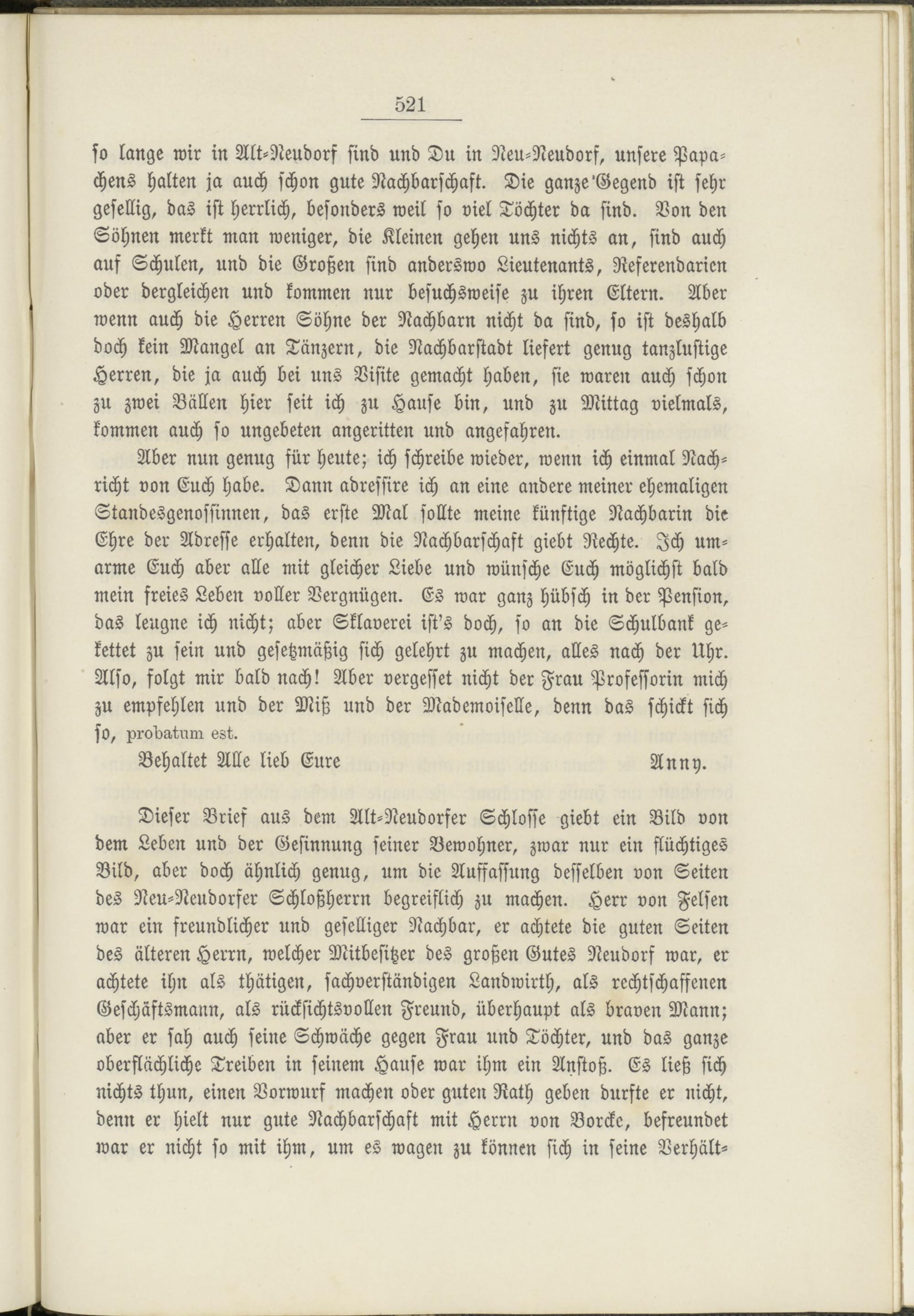 Dieser Brief aus dem Alt-Neudorfer Schlosse giebt ein Bild von dem Leben und der Gesinnung seiner Bewohner, zwar nur ein flüchtiges Bild, aber doch ähnlich genug, um die Auffassung desselben von Seiten des Neu-Neudorfer Schloßherrn begreiflich zu machen. Herr von Felsen war ein freundlicher und geselliger Nachbar, er achtete die guten Seiten des älteren Herrn, welcher Mitbesitzer des großen Gutes Neudorf war, er achtete ihn als thätigen, sachverständigen Landwirth, als rechtschaffenen Geschäftsmann, als rücksichtsvollen Freund, überhaupt als braven Mann; aber er sah auch seine Schwäche gegen Frau und Töchter, und das ganze oberflächliche Treiben in seinem Hause war ihm ein Anstoß. Es ließ sich nichts thun, einen Vorwurf machen oder guten Rath geben durfte er nicht, denn er hielt nur gute Nachbarschaft mit Herrn von Borcke, befreundet war er nicht so mit ihm, um es wagen zu können sich in seine Verhält-